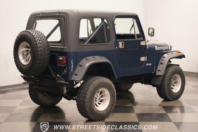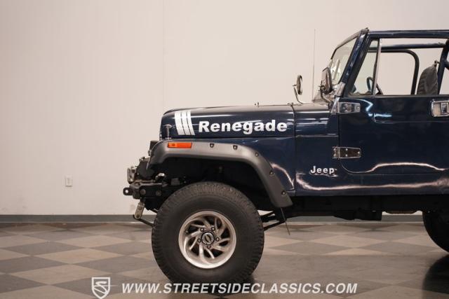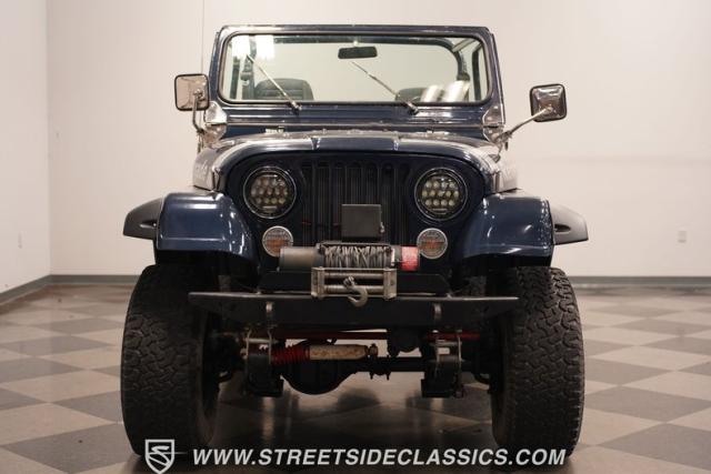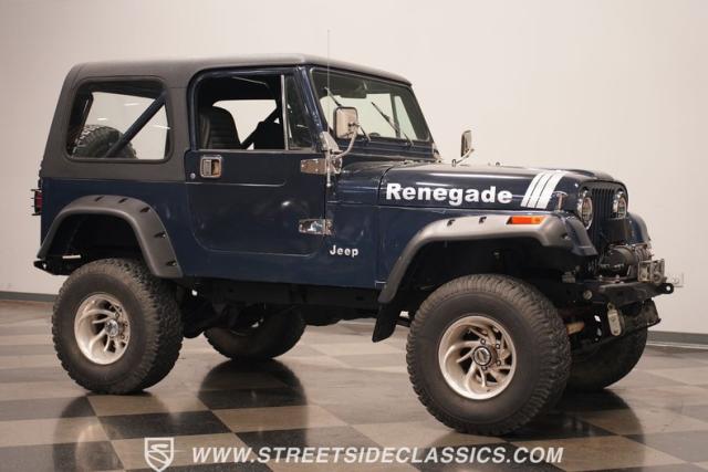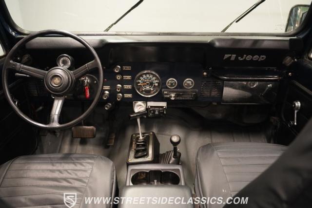 Navigating both city streets and rugged trails with equal poise, this 1985 Jeep CJ7 revs up enthusiasm with its bold Navy Blue Metallic paint and Renegade decals. The exterior is equipped to make a lasting impression, sporting 15\" alloy wheels wrapped in 33x12.50R15LT all-terrain tires, capable of tackling any adventure. The presence of a hard top and a supplementary bikini top offers versatility while the silver stripes along the body reflect a playful yet aggressive spirit. Enhanced with a 3-inch lift kit and chrome accents, this Jeep stands tall, ready to dominate any terrain.
