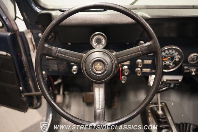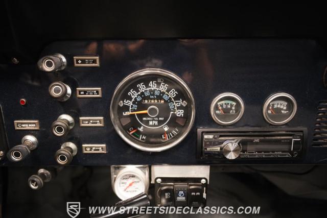 Inside, the Jeep CJ7 offers a blend of utility and comfort. Black vinyl seats, resilient against the elements, align with the Jeep\'s adventurous ethos, while garnet vinyl denim bucket covers add a touch of sophistication. The floor-mounted shifter and central console integrate functionality with style, complemented by door panels that keep essentials within easy reach. The setup is complete with an AM/FM single CD player equipped with USB and AUX inputs, ensuring connectivity and entertainment is always on hand.