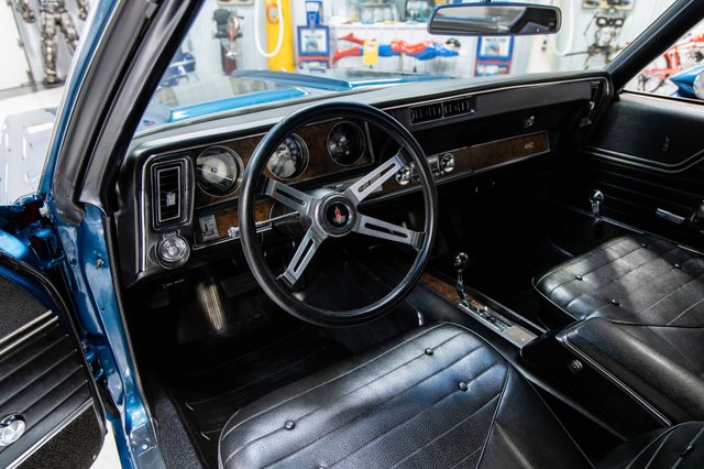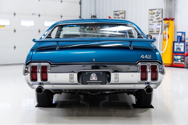 This documented Twilight Blue 1970 Oldsmobile 442 W30 with factory air conditioning and original matching-numbers drivetrain was restored to high show quality standards. It was certified as authentic by expert Chris White of Concours Concepts on July 6th, 2025. A total of 3,100 Oldsmobile 442 W30 models were produced in 1970 of which only 2,574 were Holiday Coupes. This collector grade example is accompanied with the original factory build sheet, original factory broadcast line card, original factory window sticker, original pre-delivery check sheet, original factory owner's manual and warranty booklet with protect-o-plate. It was ordered with a (28)- Twilight Blue exterior and (30)- black vinyl interior. It was ordered with the following options: (AK1)-deluxe seat belts, (A01) - soft ray tinted glass, (B32)-auxiliary front floor mats, (B85) - chrome side window moldings, (B93) - chrome door edge guards (C60)- air conditioning, (D35)- sport mirrors, (G80)- 3.23 limited slip rear axle, (JL2)- power front disc brakes, (M40)- turbo-hydramatic transmission, (N42)- deluxe steering wheel, (N47)- power steering, (N66)- super stock II wheels, (PK5)- raised white letter wide oval tires, (T44)- interior hood lock, (U15)- safety sentinel (speed minder), (U21)- rocket rally pac gauges, (U57) – stereo tape player, (U63)- deluxe pushbutton radio, (W26)- Hurst dual gate shifter, (W30)- performance package and (Y60)- courtesy lamps. The original factory MSRP was $5,219.23. This car was built in Lansing, Michigan on the 3rd week of October in 1969. It was delivered to Skyland Oldsmobile located in Asheville, North Carolina. It was sold to George E. Minnick of Clyde, North Carolina on November 1st, 1969. From the information gathered the car had roughly 35,000 original miles prior to the restoration and the odometer currently reads 36,852. It retains the original factory VIN Tag and original factory Cowl Tag. It was refinished in its highly desirable original factory color of Twilight Blue with black stripes. The original factory black interior was lightly restored and still retains a lot of originality. The highly detailed engine compartment is home to the original factory matching-numbers W30 455 V8 engine that was factory rated with 370 horsepower. The engine has the correct heads and intake. The engine breathes through a Gardner Concours dual exhaust system that was recently installed. The engine is coupled to the original factory matching-numbers turbo-hydramatic transmission with Hurst dual gate shifter. The power is transferred to the original factory matching-numbers 3.23 ratio limited slip rear end. The undercarriage is also highly detailed throughout. This vehicle has been completely serviced and detailed which is documented with an invoice. From the MS CLASSIC CARS Collection.
