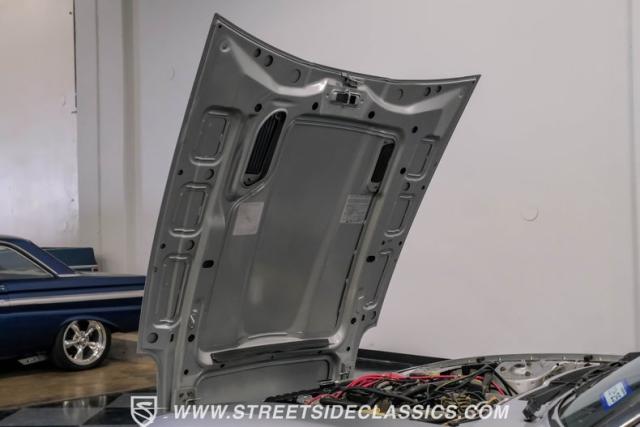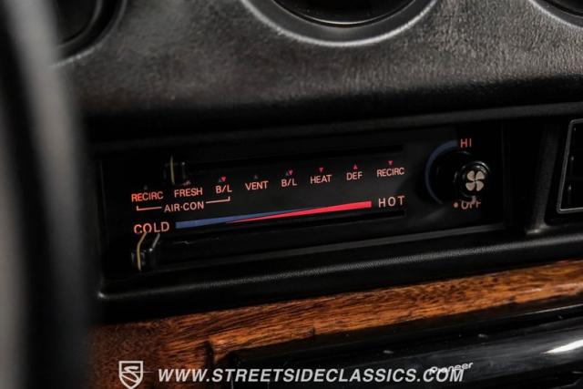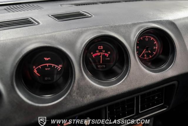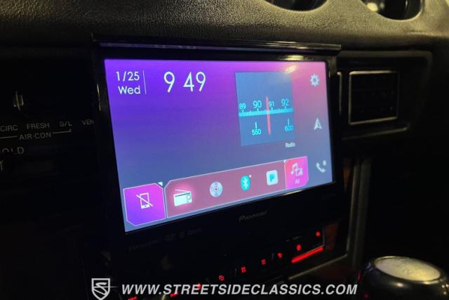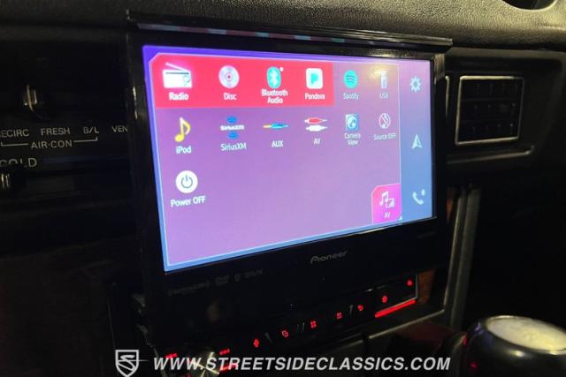 Inside, black vinyl wraps the cabin in a driver-focused environment. Bucket seats flank a center console, emphasizing the car\'s performance heritage. A modern Pioneer radio featuring a flip-up touchscreen with AM/FM/CD/Bluetooth and navigation brings 21st-century tech to this \'70s icon. The dashboard houses clear, easily readable gauges that keep vital information front and center. Power steering allows for quick, responsive handling, while the air conditioning system blows cold, keeping occupants cool during spirited drives. The 5-speed manual shifter, perfectly positioned for easy reach, begs for action.