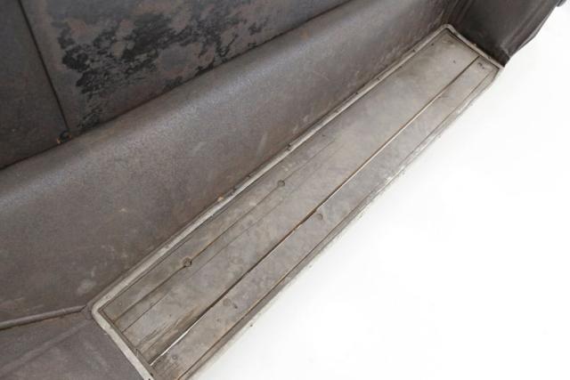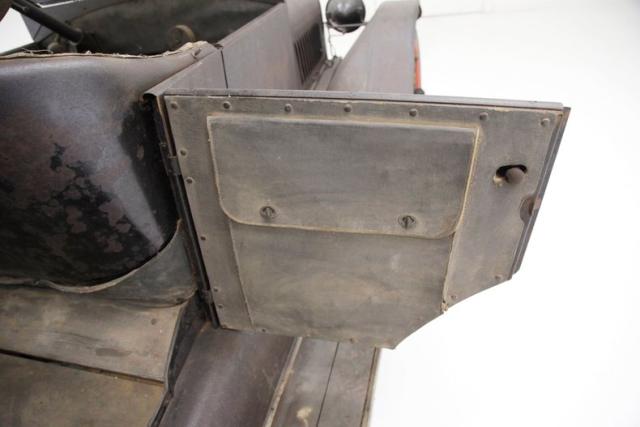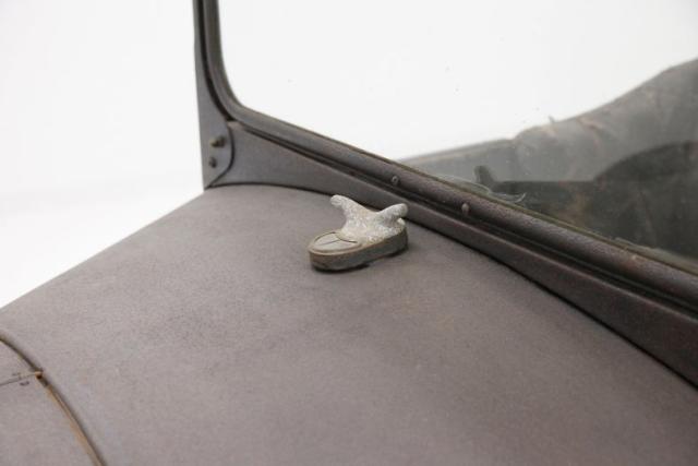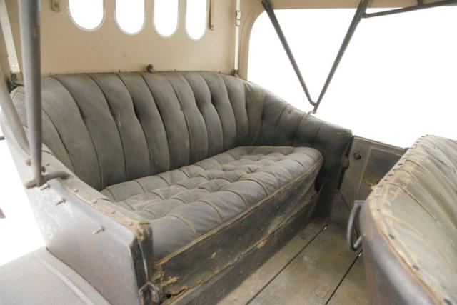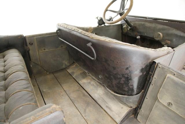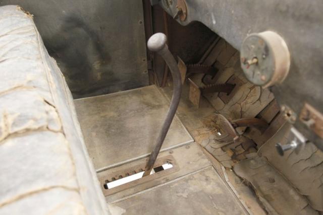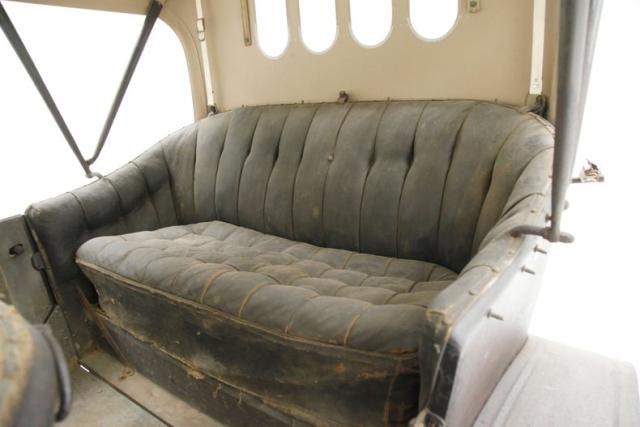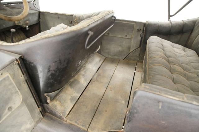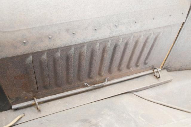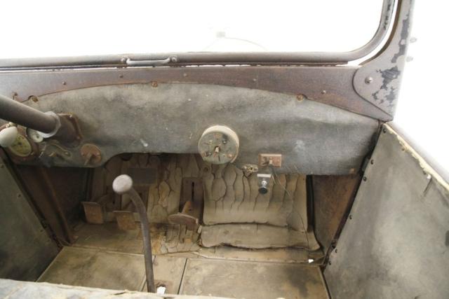 Also unrestored, with faded and worn black smooth vinyl covering the door panels and we note storage pouches on both rear doors. A worn black vinyl fronted dash curves up to the front windshield and in front of the driver is a utilitarian speedometer/odometer and ammeter all in rough but usable condition is sitting behind a thick rimmed walnut wood steering wheel. Heavily tufted black tuck and roll leather covers the wrap-around bench seats both front and rear with the rear of the front seat tub being finished in black. These seats show heavy wear, weathering and seam splitting at nearly every turn. Weathered oak planks and black melamine sheeting cover the floor upfront, and the same is seen in the rear, albeit without the covering. This interior is definitely complete but ready for a full on restoration.