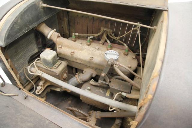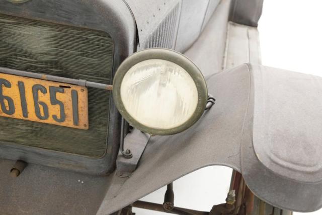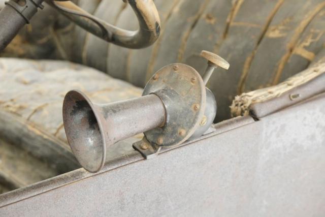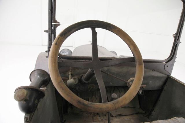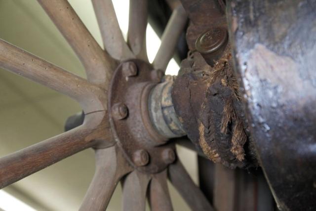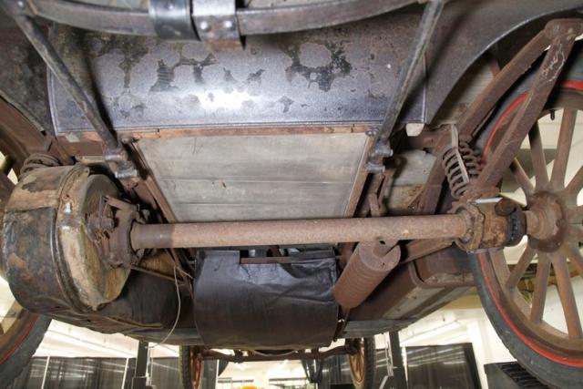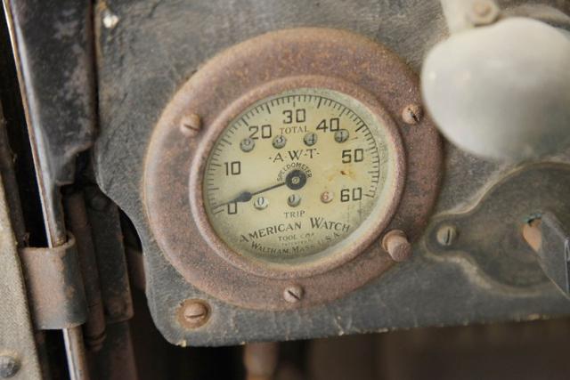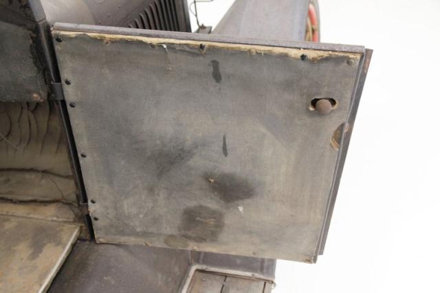 Things were far ahead of their time under the center hinged hood, featuring a 188.7ci L-head 4 cylinder. This patinaed and rusty mill is fed by a 1bbl carburetor, and a direct-drive shaft leads rearward. New ideas were in vogue during the early days of motoring and Metz was far ahead of its time. In place of a traditional transmission, or even a planetary style transmission we see a simple steel disc. A drive wheel, actuated by the shift lever above is designed to move inward and outward on the friction disc thus increasing rotational speeds sent to the 4.00 geared rear axle via the single drive chain. A precursor to the CVT transmissions of today if you will.