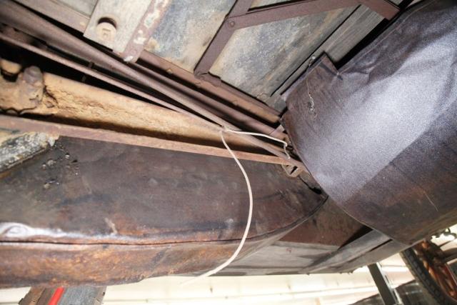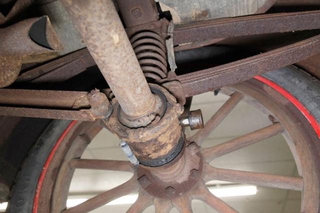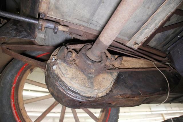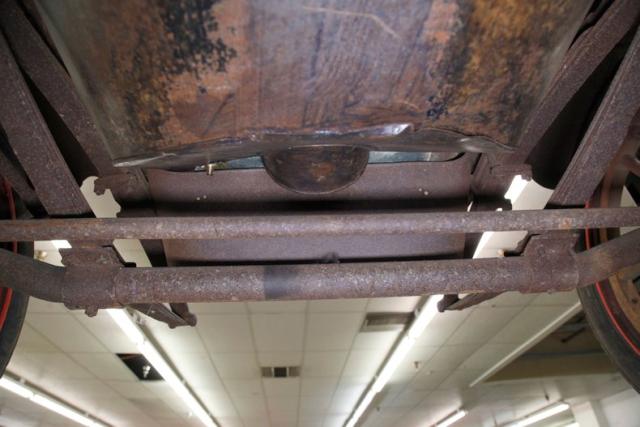 Heavily surface rusted under here along with lots dust and patina from age, but overall things remain solid. We do note a small tear/crack in the frame, however it does not appear to be caused by invasive rust. This car was a pre 4-wheel braked car, only sporting mechanical rear drum brakes. All leaf spring suspension is seen and underneath gives us a clear view of the friction disc and chain drive mechanisms.