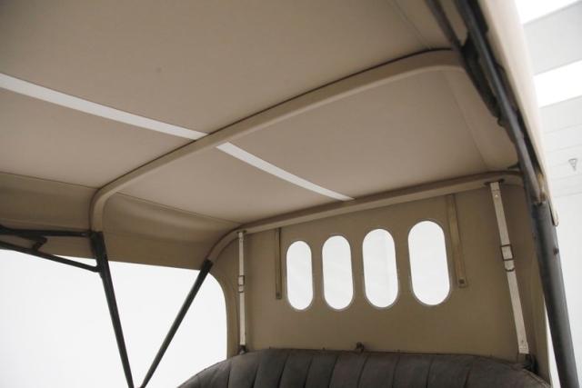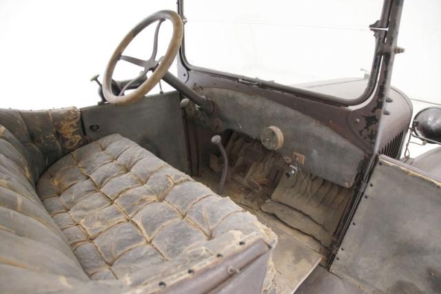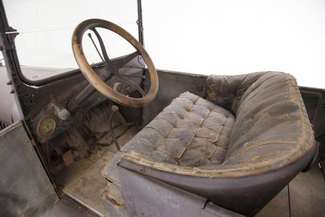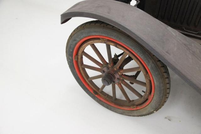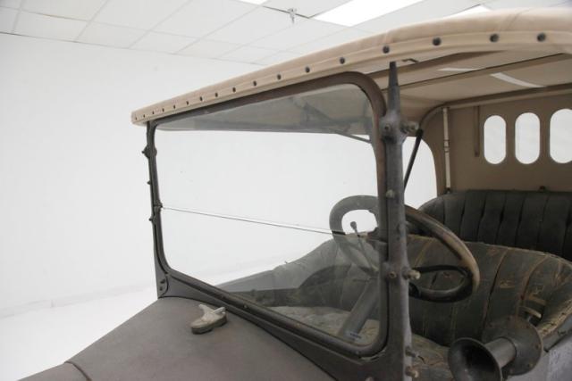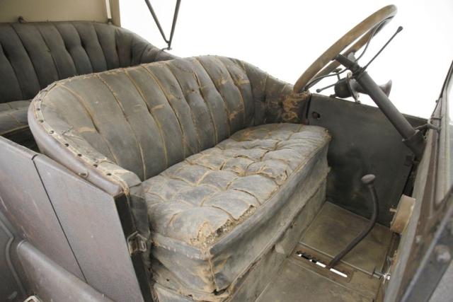 Automobiling was in its growth spurt in the 19-teens with over 485,000 of the world\'s 606,000 cars having been produced in the good old US of A. With its simply designed \"tub\", this 4-door convertible touring sedan is fairly straight, however the paint is showing as a faded satin black primer on the body. A few dents, dings and areas of painted over surface rust are noted throughout. Curvaceous fenders attached to long running boards and have slight cracking of the wood, they\'re called running \"boards\" for a reason...but I digress. The long hood in its cowling style is fronted by a surface rusted radiator surround, faded Metz badging, and a corroded dogbone radiator cap. 2 simple large tarnished brass trimmed can headlights flank the grille, and float above the front fenders. Tan canvas makes up the foldable roof over the passengers and shows as nearly new without any flaws. In the back, attached to the body tub, is a single spare tire and a small round tail light decorates the driver\'s rear fender. Red trimmed 32\" wood spoke wheels adorn the 4 corners and are shod in like new 32x3.5\" Dunlop rubber.