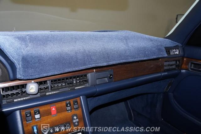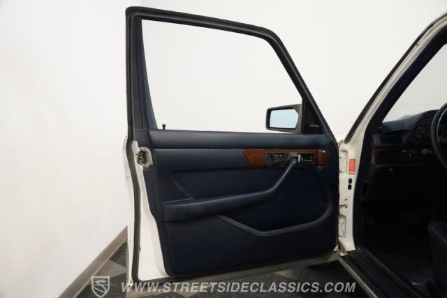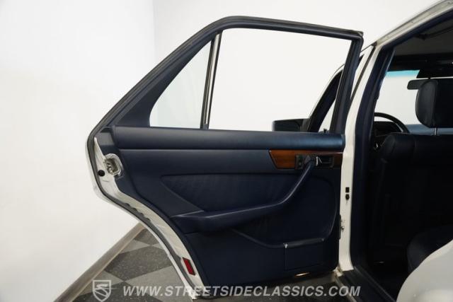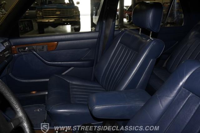 Step inside to find a dark blue leather interior that offers both comfort and classic Mercedes-Benz style. The cabin features factory bucket seats and a center console with a console-mounted shifter, providing a driver-focused layout. The interior remains largely original with light wear consistent with its age, complemented by an aftermarket Sony AM/FM CD stereo deck for modern convenience. The headliner and rear bench seat are in good condition, and the door panels show only minor wear, making the interior inviting and authentic.