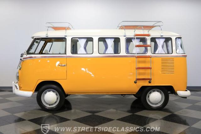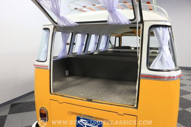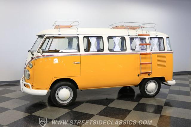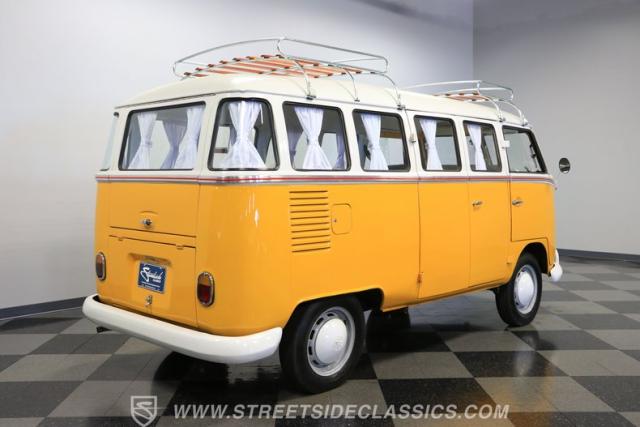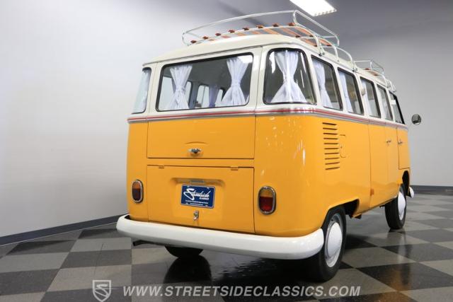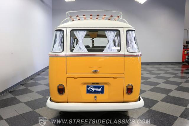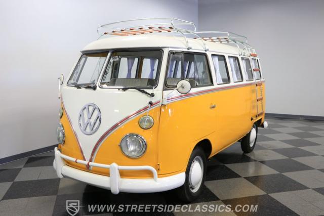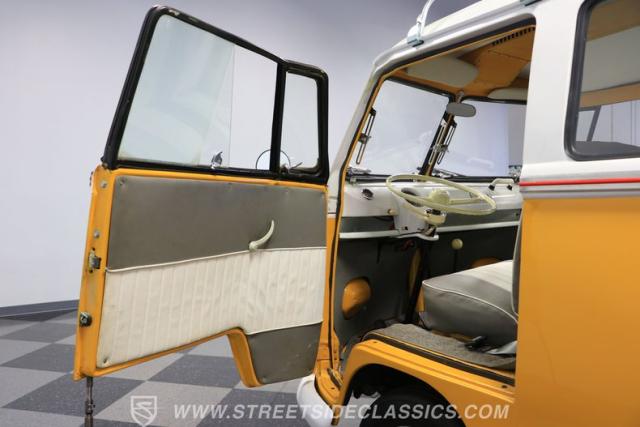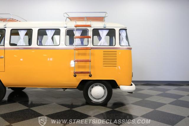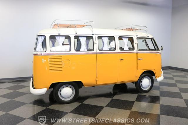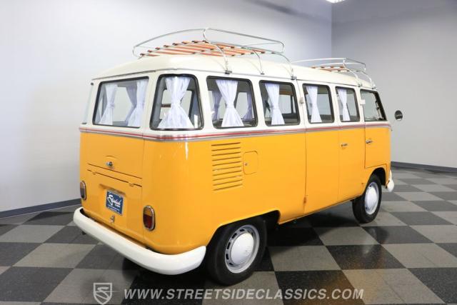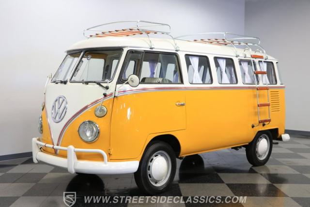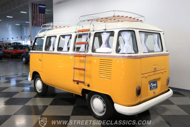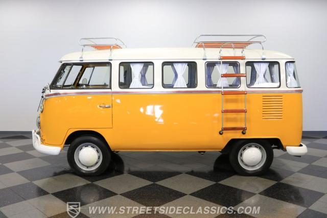 The former owners of this Bus have lavished a lot of time and attention preserving, restoring, and caring for this VW throughout the years, and the results are pretty impressive. It\'s not low-key with its Lotus White-over-Chrome Yellow paint scheme, curtain-covered windows, and teakwood ladders and roof racks, but the good-looking, driver-grade paint isn\'t the only thing that this VW is about. Instead, it\'s about details, and here there are many. First and foremost, you\'ll note all the windows 15 in total that instantly make this Bus more valuable, not to mention incredibly good-looking. Splitties (split front windshield) are the most sought-after and most valuable VWs as well, and even though the Germans ditched the design after 1967, DeLuxe models like this 1974 Bus (not available in Europe) kept the highly-desirable look up front, making this first-year Type 2 one of the best examples to own. Not only do they mimic the look of the 1st generation Microbus (without all the headaches of 1960s build quality), but they look the best and are significantly lighter than the loaves of bread that came after. So, as a rule of thumb, count the windows the more there are, the more valuable the Bus is, and this rare beauty has 15 of them. Also note the clean, unadorned lines on the body that are accentuated by straight, original bodywork - not hippie art or silly graphics - and the smooth, shiny driver-quality paintwork that shows incredibly well on this icon. The paint was applied many years ago, and it does have a very light patina acquired in the subsequent years, and even though it\'s not a perfect trailer queen today, any owner would be proud to show this beauty off. We may be underselling it because it still has a lovely shine, great depth, and a very nice, uniform presentation. That gorgeous red pinstripe that separates the two colors is the perfect line of demarcation between the competing shades. Components like the painted white bumpers and a big chrome VW emblem in the center of the front end are trademarks that VW faithful can recognize from a mile away, and all those windows make it as bright and airy inside as you\'d expect. The swooping, bright trim that starts at the nose and wraps around the top half of the body is in good shape, showing off a slight haze in some spots that only adds a little extra character to this Bus.