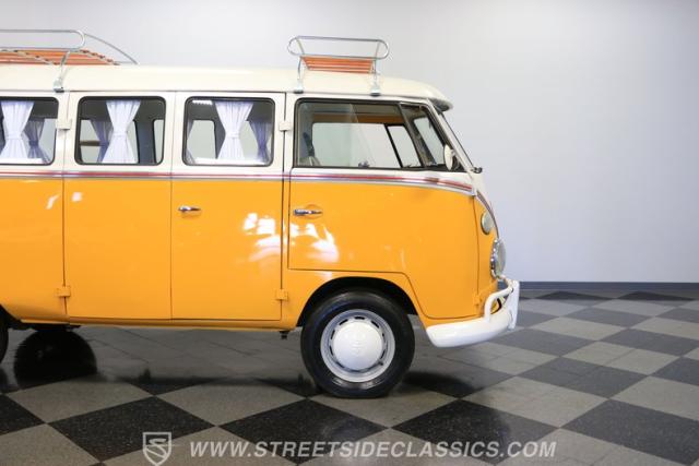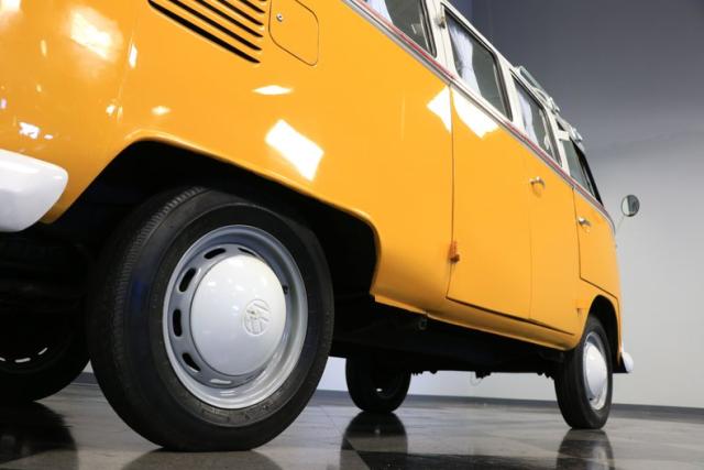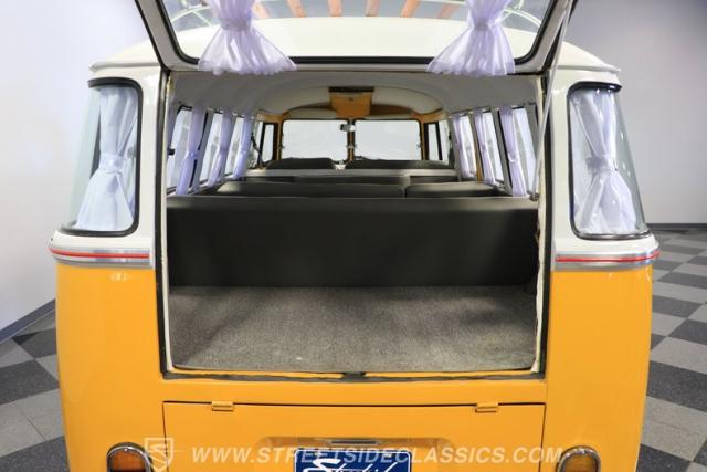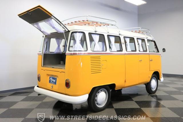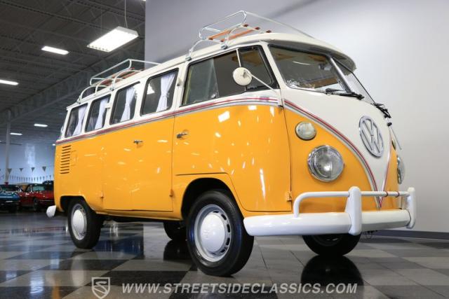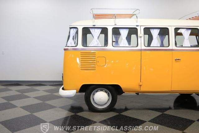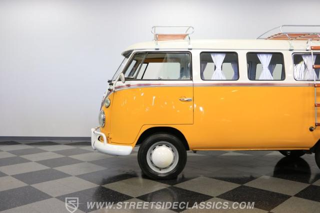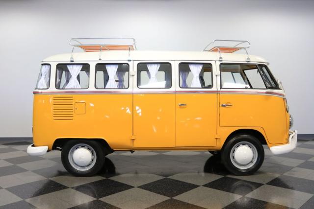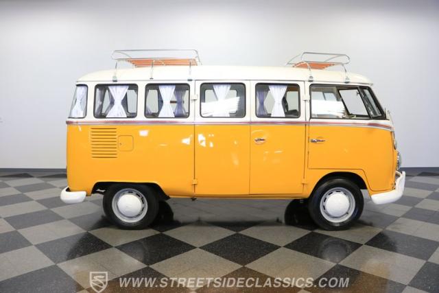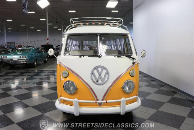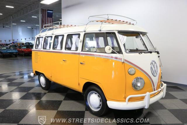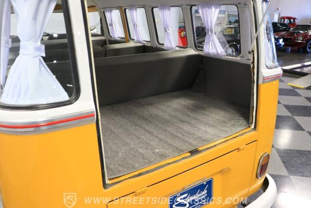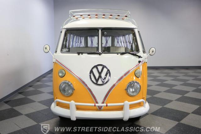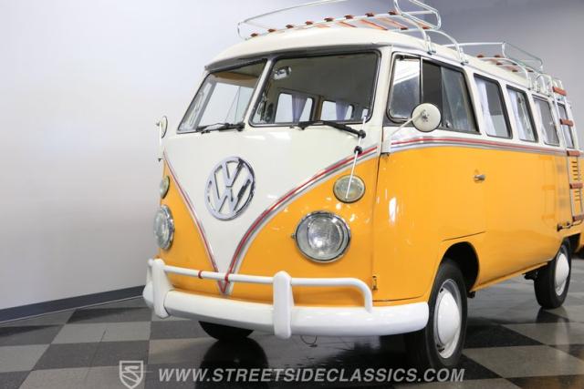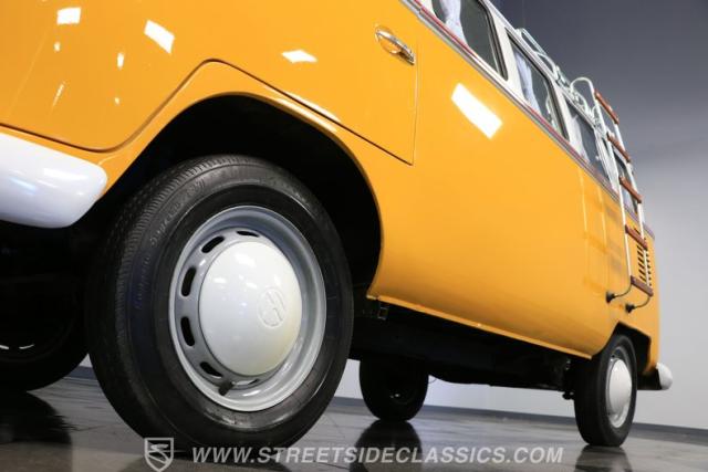 The former owners of this Bus have lavished a lot of time and attention preserving, restoring, and caring for this VW throughout the years, and the results are pretty impressive. It\'s not low-key with its Lotus White-over-Chrome Yellow paint scheme, curtain-covered windows, and teakwood ladders and roof racks, but the good-looking, driver-grade paint isn\'t the only thing that this VW is about. Instead, it\'s about details, and here there are many. First and foremost, you\'ll note all the windows 15 in total that instantly make this Bus more valuable, not to mention incredibly good-looking. Splitties (split front windshield) are the most sought-after and most valuable VWs as well, and even though the Germans ditched the design after 1967, DeLuxe models like this 1974 Bus (not available in Europe) kept the highly-desirable look up front, making this first-year Type 2 one of the best examples to own. Not only do they mimic the look of the 1st generation Microbus (without all the headaches of 1960s build quality), but they look the best and are significantly lighter than the loaves of bread that came after. So, as a rule of thumb, count the windows the more there are, the more valuable the Bus is, and this rare beauty has 15 of them. Also note the clean, unadorned lines on the body that are accentuated by straight, original bodywork - not hippie art or silly graphics - and the smooth, shiny driver-quality paintwork that shows incredibly well on this icon. The paint was applied many years ago, and it does have a very light patina acquired in the subsequent years, and even though it\'s not a perfect trailer queen today, any owner would be proud to show this beauty off. We may be underselling it because it still has a lovely shine, great depth, and a very nice, uniform presentation. That gorgeous red pinstripe that separates the two colors is the perfect line of demarcation between the competing shades. Components like the painted white bumpers and a big chrome VW emblem in the center of the front end are trademarks that VW faithful can recognize from a mile away, and all those windows make it as bright and airy inside as you\'d expect. The swooping, bright trim that starts at the nose and wraps around the top half of the body is in good shape, showing off a slight haze in some spots that only adds a little extra character to this Bus.