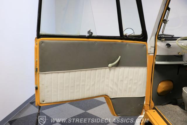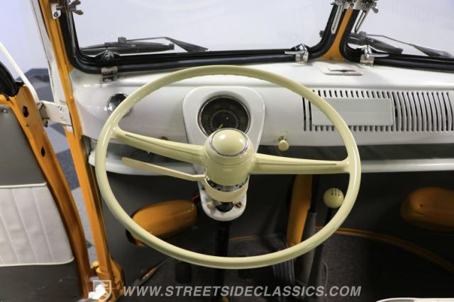 With a spacious cabin that\'s been impeccably cared for through the years, the interior offers great two-tone colors and spacious accommodations for several passengers, and the classic style is always impressive. The White-and-Gray vinyl split-bench seat up front sets the tone, and there are two more matching benches waaaay in the back, all of which are in great shape with excellent springs inside. The seats are covered in an uber-durable vinyl upholstery that resembles cloth. The soft colors on the seats and matching two-tone door panels complement the exterior perfectly. All the side panels were covered in two-tone vinyl to keep the color theme inside and give the cabin a finished look. The taut white headliner overhead and tough indoor/outdoor carpeting covering the floors underneath keep everything well-insulated and authentic inside. Ornate privacy curtains were expertly stitched and purposely selected to match the interior and add a touch of home, making the cabin an exceptional place to spend some time. The front seats offer a commanding view of the road completely free of obstructions, and the bus-like driving position is very comfortable for long trips, which is what these buses were designed to do. The dash is mostly stock, with the factory speedometer ahead of the driver, the fuel gauge just to the left, and the grab handle down on the other side. That upright original steering wheel was fully restored and feels great in the hands of the driver, and a tall shifter juts out from the floorboard and manages the 4-speed manual transmission below. In addition to the rear bench seats, there\'s a large and nicely upholstered package shelf/storage area atop the engine bay in the back that is often used as a bed, a space for \'alternative herbal reflection\', or whatever else floats your boat.