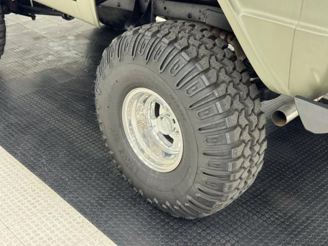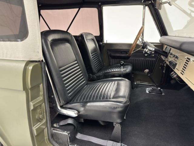 This thing has a big presence, and high! We\'ll get to the lift specs, but the height is certainly helped by the 15-inch wheels holding 37x12.5R15\'s. Hovering up above those tires is a Matte Green truck augmented up front with modern, smoked LED headlights, KC foglights, and the requisite Smittybilt winch ready to pull plebeian cars from ditches at a moment\'s notice. A hood scoop lives up top along with heat extracting louvers closer to the cowl. Right angles take over from there with a nearly vertical windshield and rear window as a gray soft top with tinted plastic windows adds some bumps and curves to the square rig. Contrasting features include the custom black bumpers and ivory grille with the epic Ford embossment in red. It\'s all in great condition with no glaring exterior flaws.
