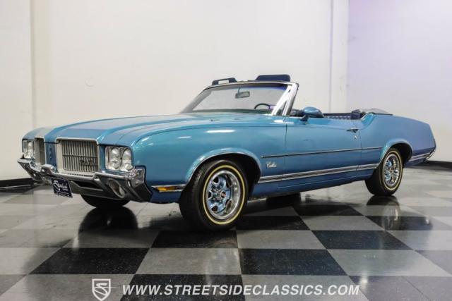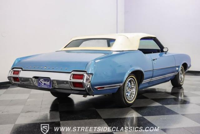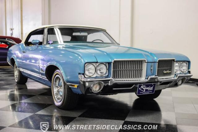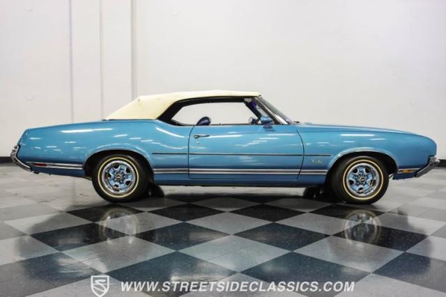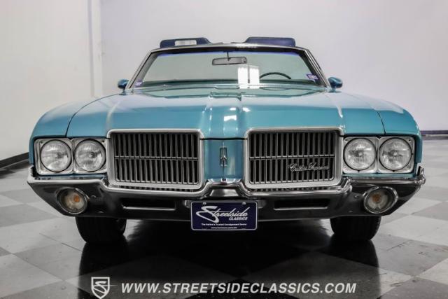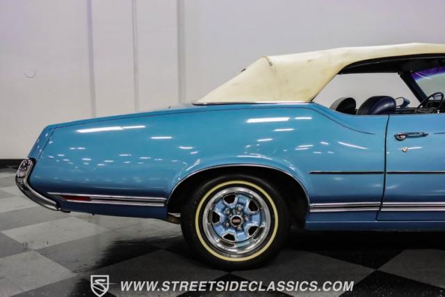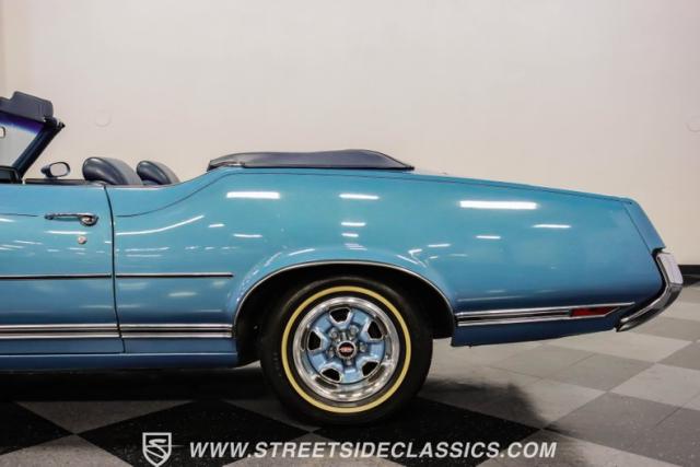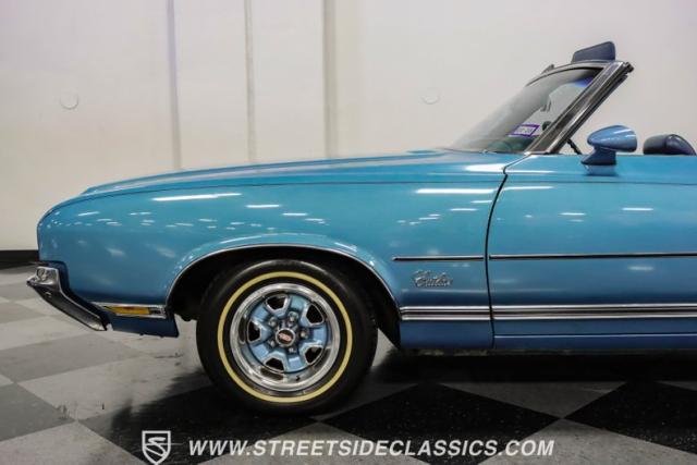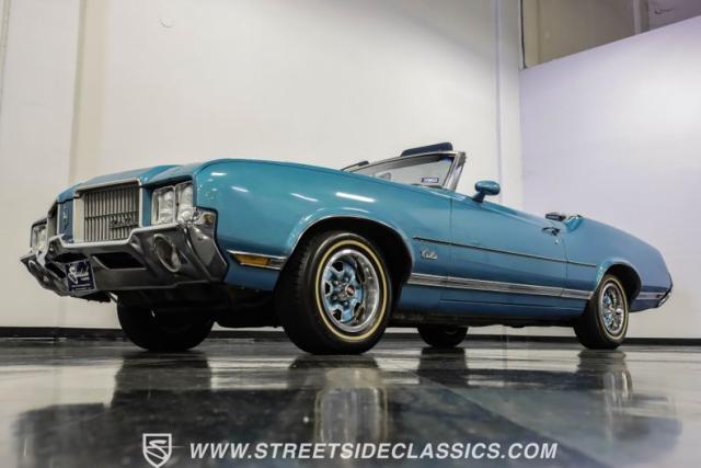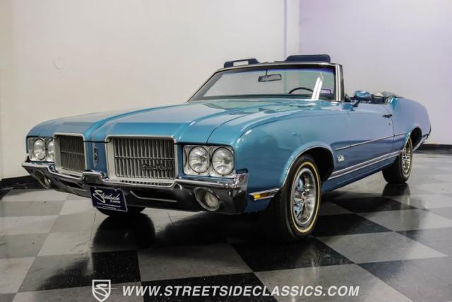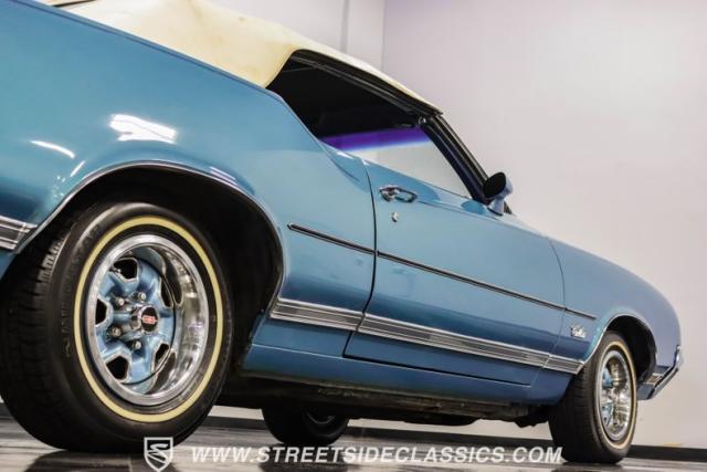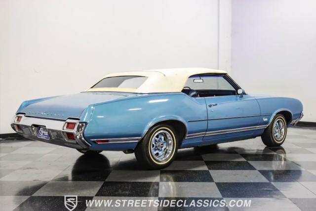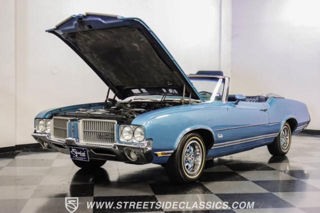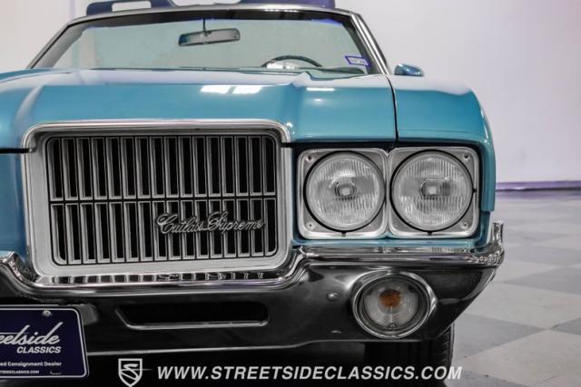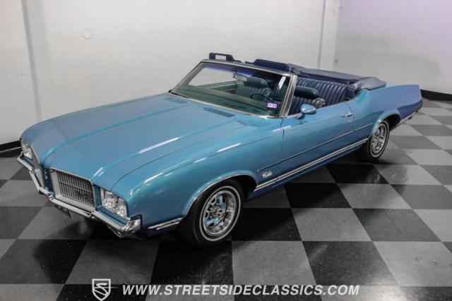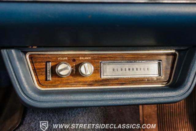 A genuine Texas survivor since rolling off the assembly line, this 1971 Oldsmobile Cutlass Supreme Convertible showcases a factory correct repaint in its original shade of Nordic Blue, accented by dark blue pinstripes that flow across its muscular profile. The fresh white vinyl power top folds away effortlessly, while the color-matched factory Rally wheels amplify its athletic DNA. LED lighting systems illuminate both ends with modern clarity, while racing-inspired sport mirrors add a competitive edge. Those wide 215/70R14 Milestar Touring tires on 14-inch wheels plant this Olds firmly on the pavement.