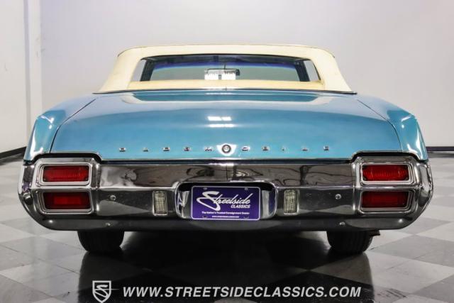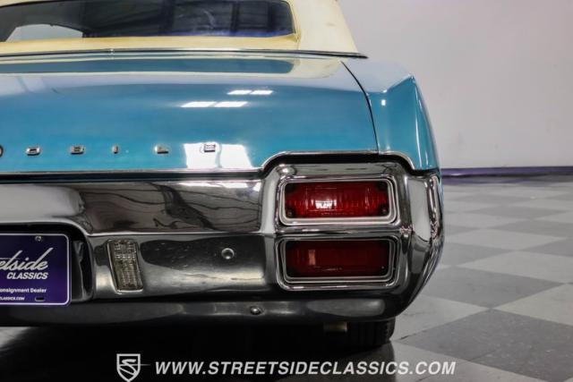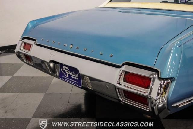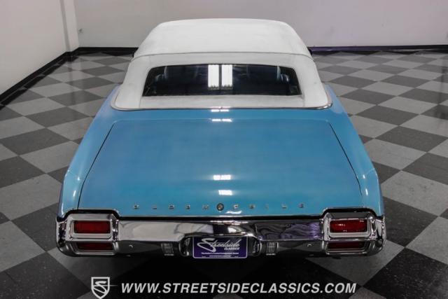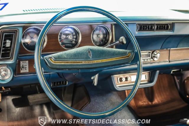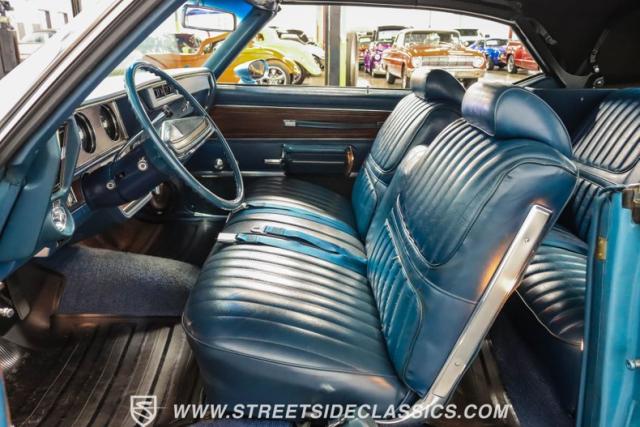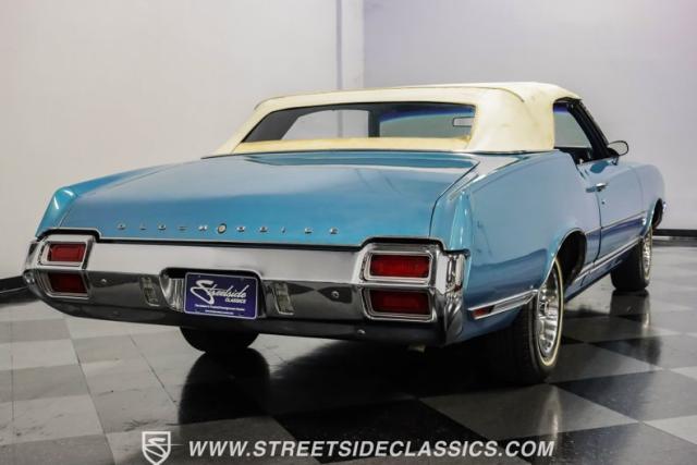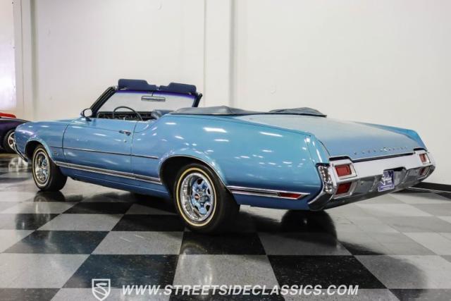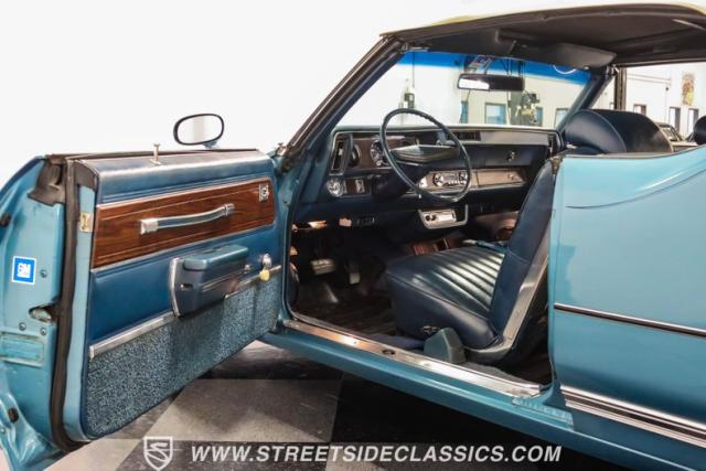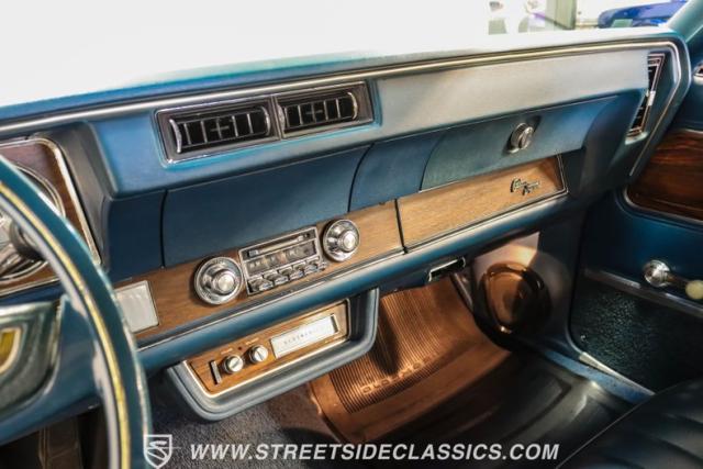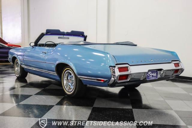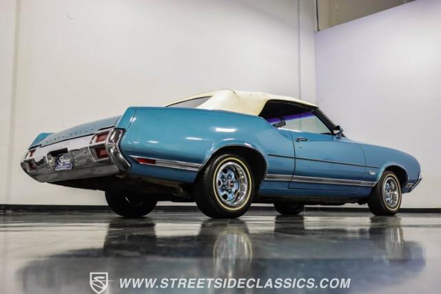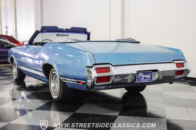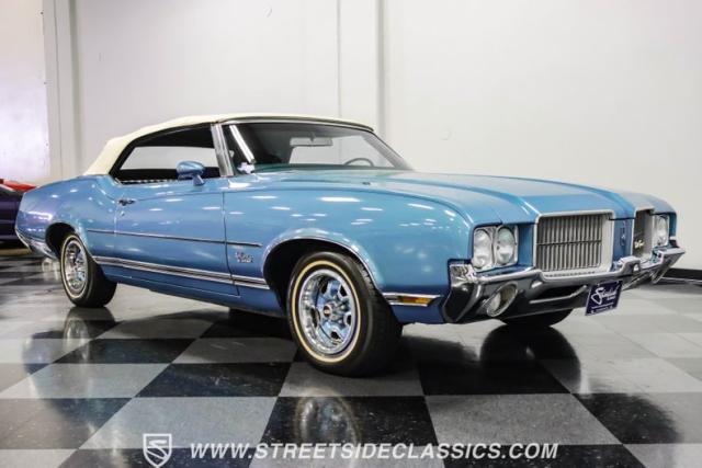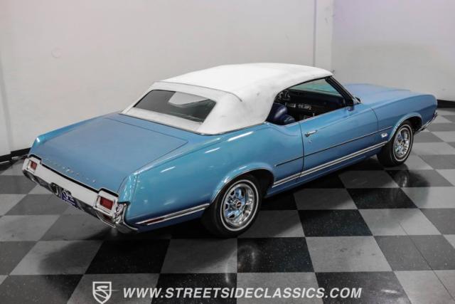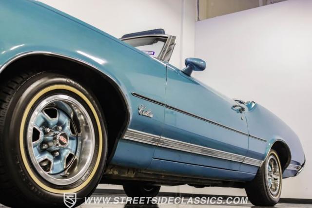 A genuine Texas survivor since rolling off the assembly line, this 1971 Oldsmobile Cutlass Supreme Convertible showcases a factory correct repaint in its original shade of Nordic Blue, accented by dark blue pinstripes that flow across its muscular profile. The fresh white vinyl power top folds away effortlessly, while the color-matched factory Rally wheels amplify its athletic DNA. LED lighting systems illuminate both ends with modern clarity, while racing-inspired sport mirrors add a competitive edge. Those wide 215/70R14 Milestar Touring tires on 14-inch wheels plant this Olds firmly on the pavement.