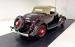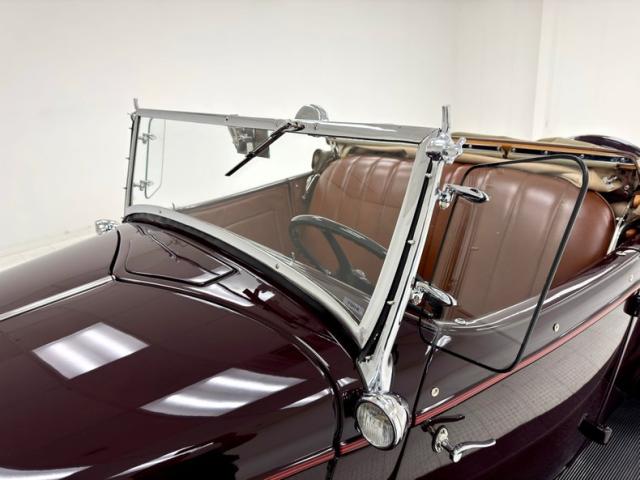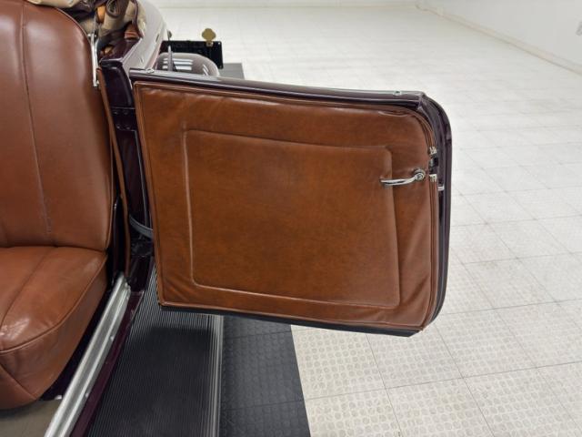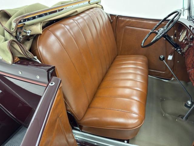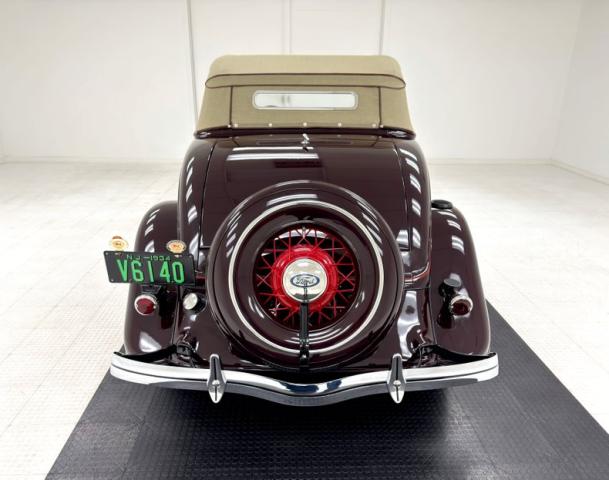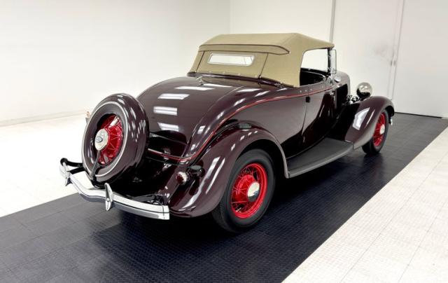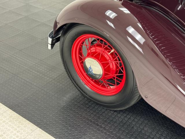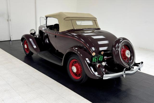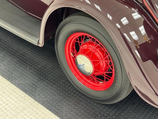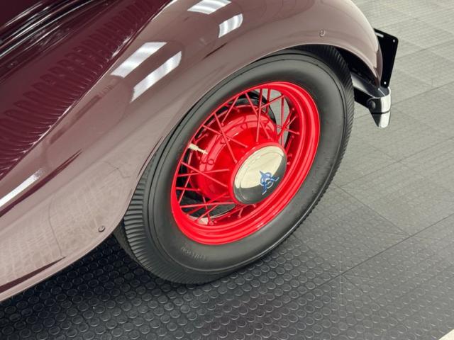 Two stage Coach Maroon covers both the body and fenders of this roadster, augmented by a hand pulled red pinstripe and 17-inch red wire wheels including the rear mounted spare. The stunning flowing lines of the car include new for \'34 straight hood louvers and a wide, rubber coated running board that connects the graceful, arching fenders. The number of vertical bars on the grille was reduced for \'34, but that doesn\'t make it any less stylish and the polished frame is breathtaking with all the proper ornamentation. Brown vinyl trim surrounds the flawless tan canvas top while the rear glass window is framed in metal. Overall, paint and trim are excellent with imperfections noted as a scratch near the running board, one by a hinge, and some bubbling and chipping paint from within a body line above the pinstripe.