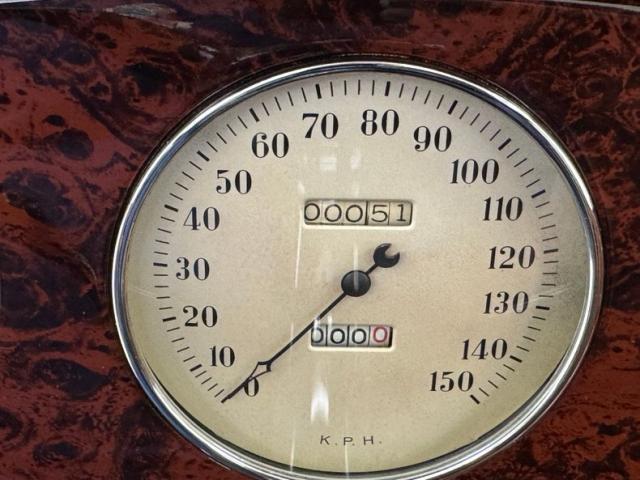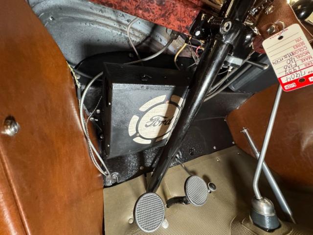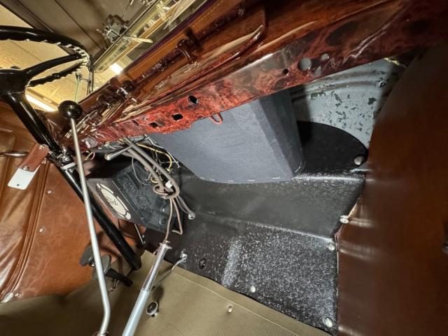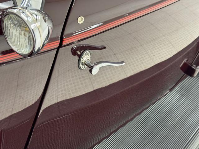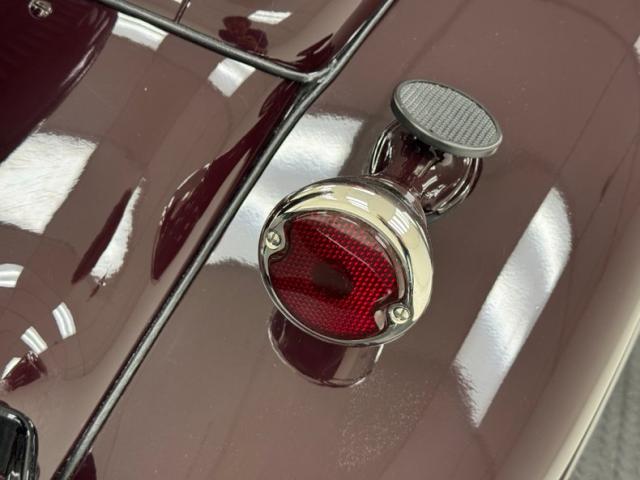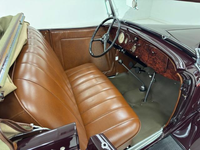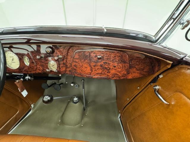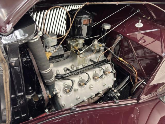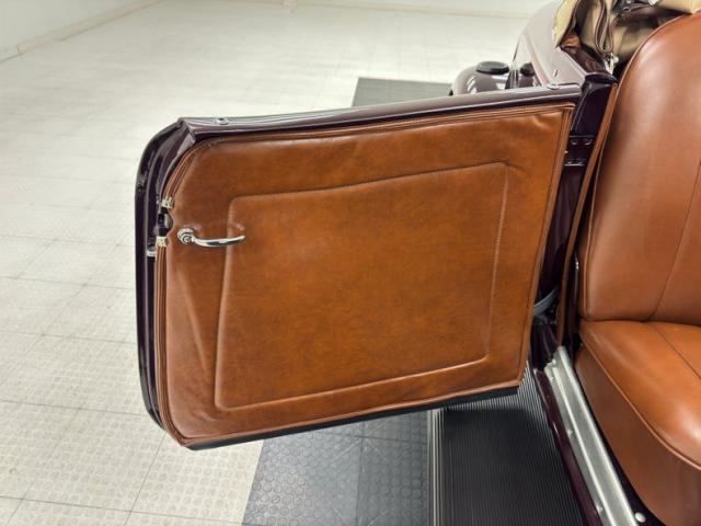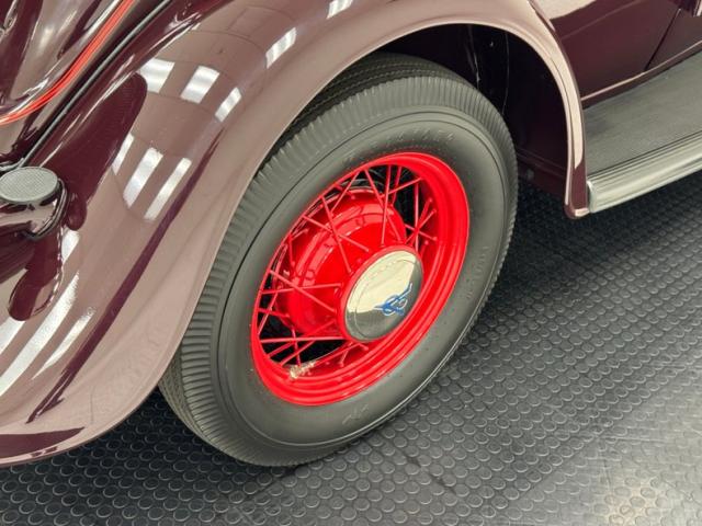 Saddle vinyl begins on the door cards as part of the LeBaron Bonney interior, continuing on the bench and rumble seats, all in very nice condition and column stitched. The attractive three spoke steering wheel front a burled walnut painted dash and knobs with refurbished gauges topped by a body colored dash pad. Footwells are cleanly lined with more of the saddle vinyl and the floor has a fitted gray rubberized mat surrounding both the shifter and the handbrake, looking fresh from 1934.