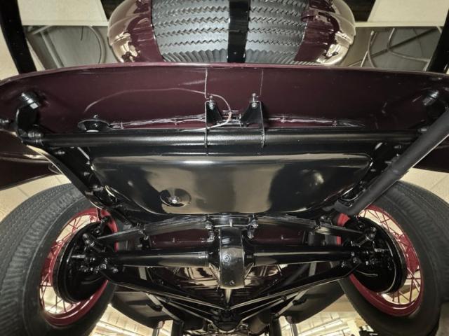 Lots of Dupont chassis black went into dressing up the underside and it\'s incredibly clean, contrasting nicely against the maroon floor panels. Mechanical drum brakes are front and rear and so are transverse leaf springs for suspension. The newer exhaust is a single system that flows through a stock style dome muffler with new hangers, exiting just behind the rear bumper.
