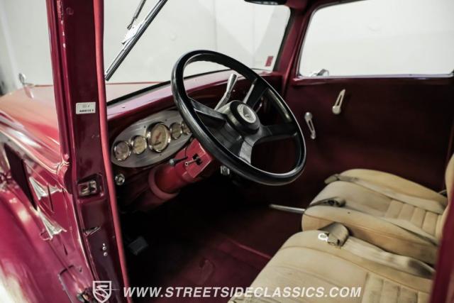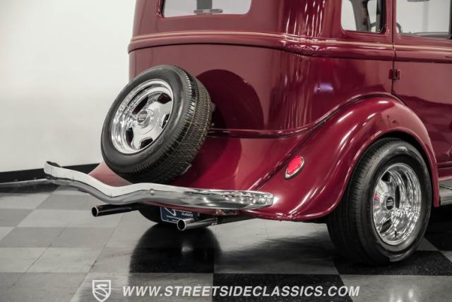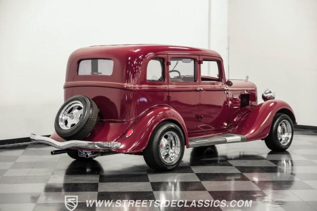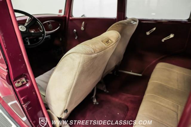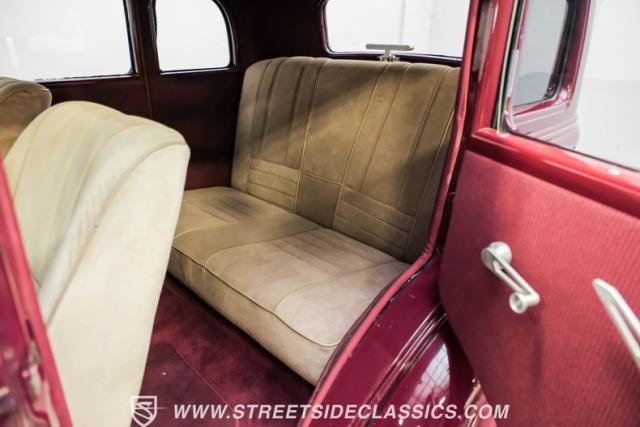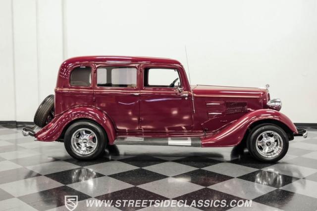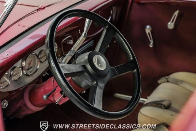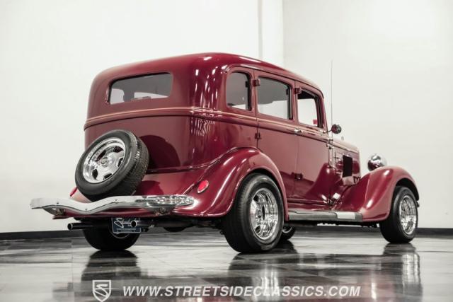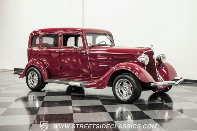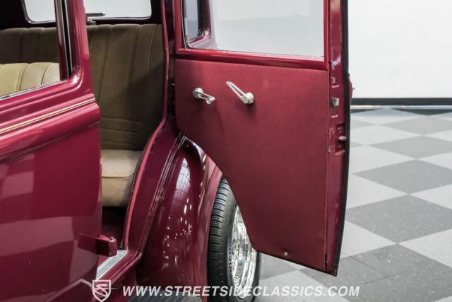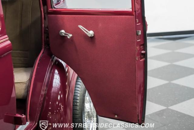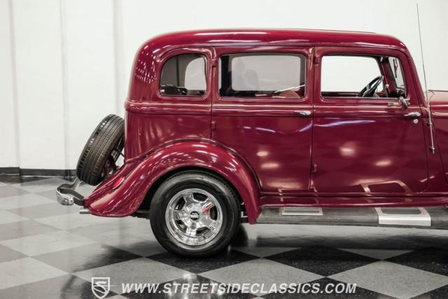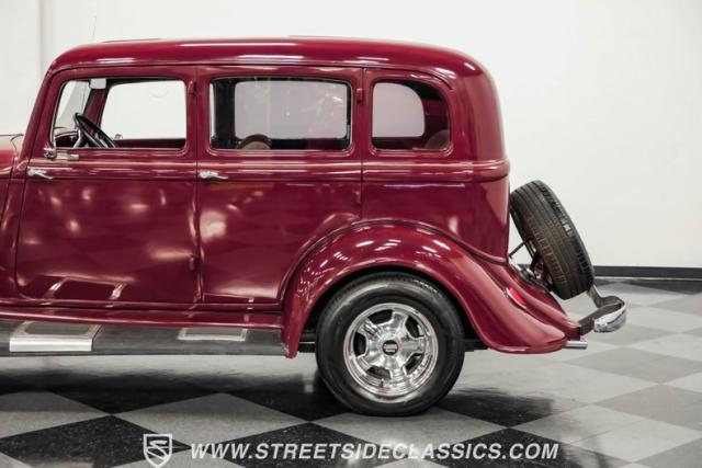 This all steel 1934 Plymouth Sedan showcases hot rod attitude with its rich maroon finish, accented by precision-crafted tan pinstriping that flows across its all-steel body. Custom American Racing chrome wheels sized at 15 inches amplify the classic profile, while Hankook tires (205/60R15 front, 235/60R15 rear) provide modern grip. The suicide front doors add authentic street rod character, while the bedliner-coated running boards deliver both style and durability.