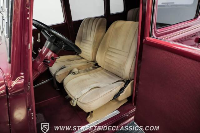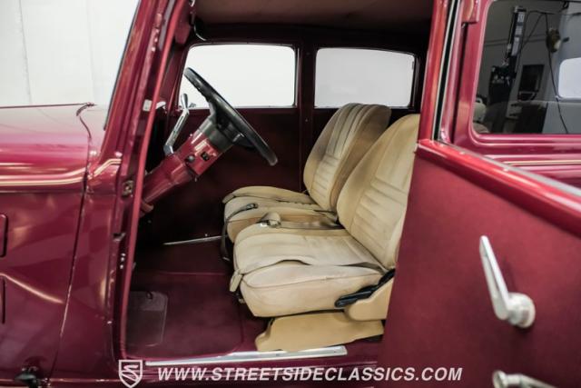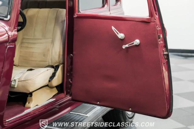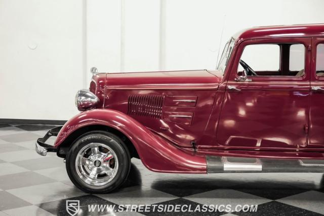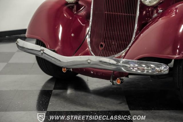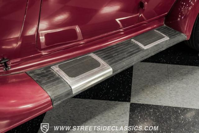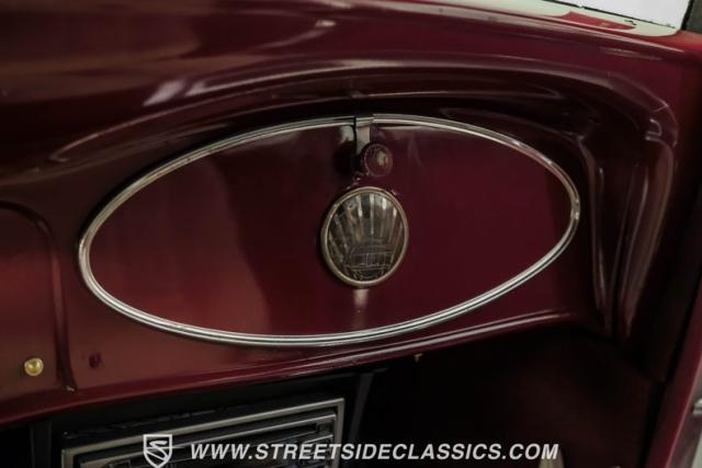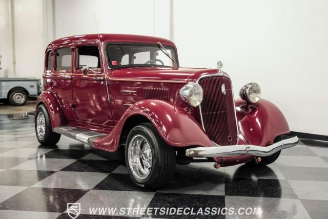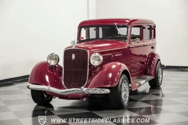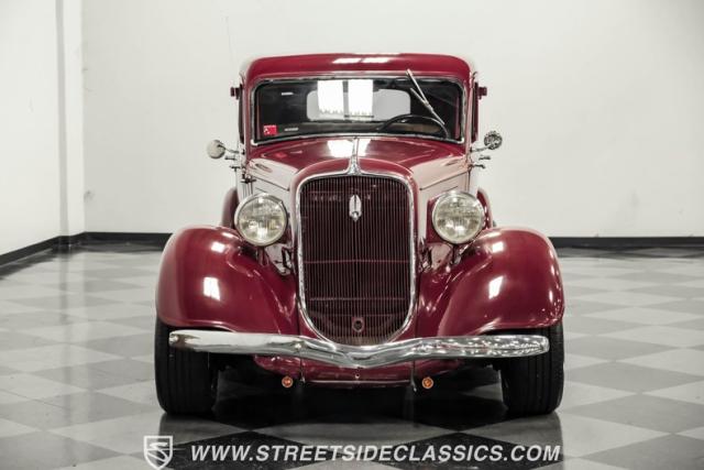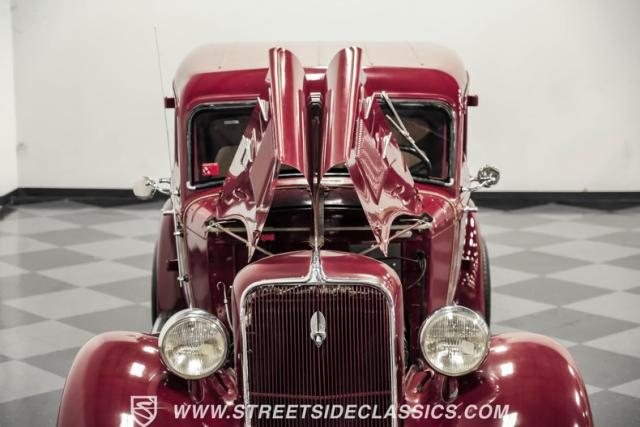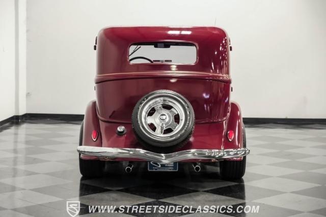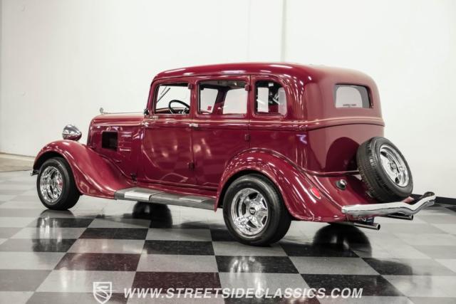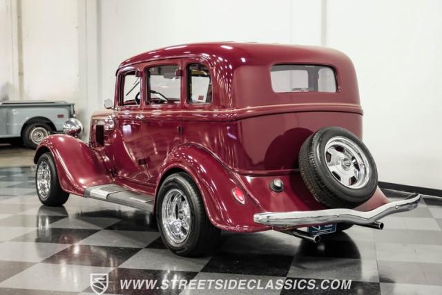 This all steel 1934 Plymouth Sedan showcases hot rod attitude with its rich maroon finish, accented by precision-crafted tan pinstriping that flows across its all-steel body. Custom American Racing chrome wheels sized at 15 inches amplify the classic profile, while Hankook tires (205/60R15 front, 235/60R15 rear) provide modern grip. The suicide front doors add authentic street rod character, while the bedliner-coated running boards deliver both style and durability.