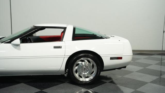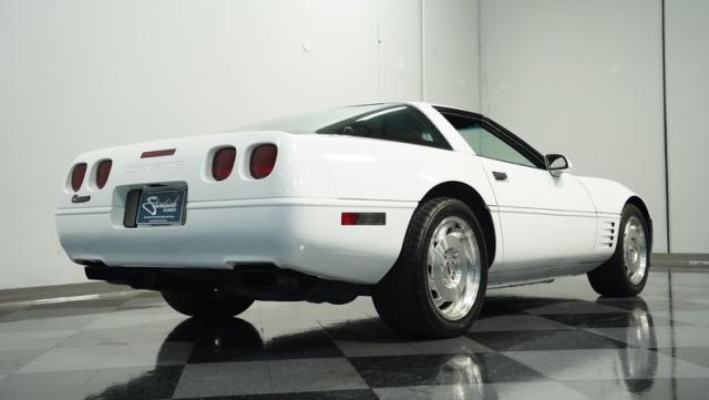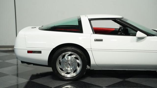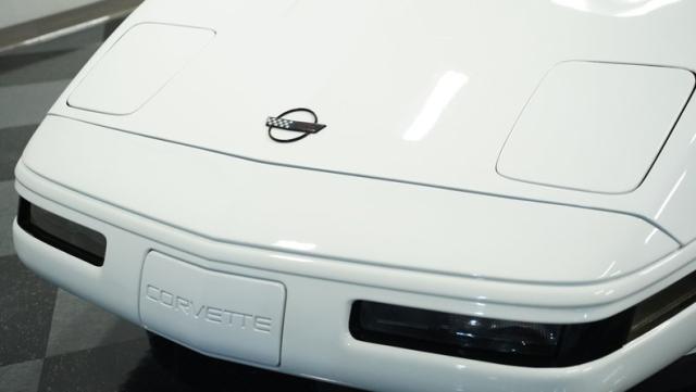 This 1994 Chevrolet Corvette, showing a mere 15,050 miles on the odometer, is a genuine time capsule of American muscle. Its Arctic White exterior gleams with the brilliance of a well-preserved classic, accentuating the iconic C4 body lines. The sleek silhouette is complemented by 17-inch wheels, wrapped in beefy 255/45ZR17 front and 285/40ZR17 rear tires, giving this Corvette a commanding road presence. This particular model features the coveted glass hatchback, a design element that perfectly balances form and function.