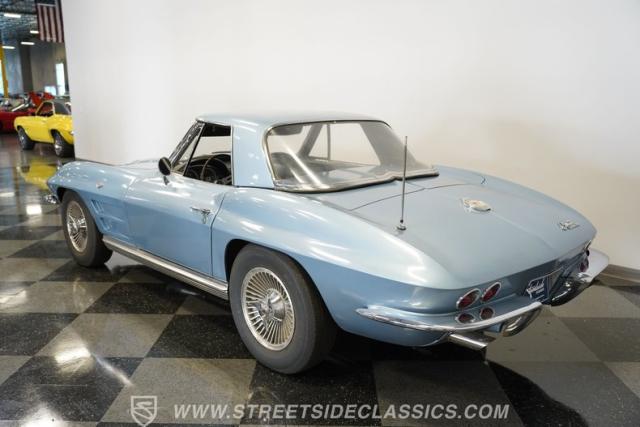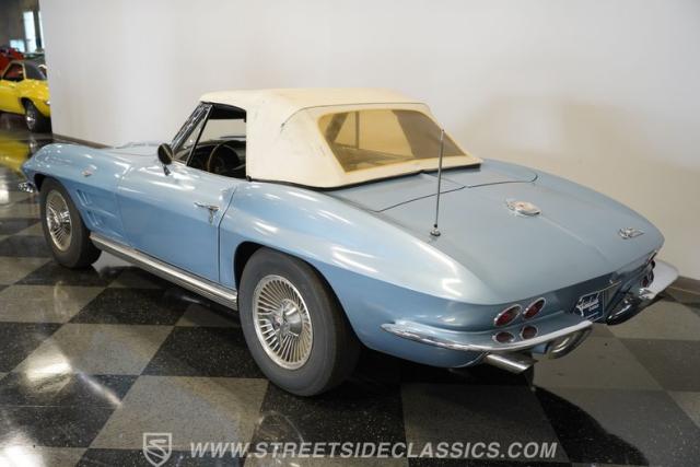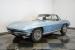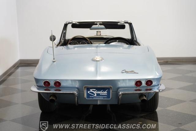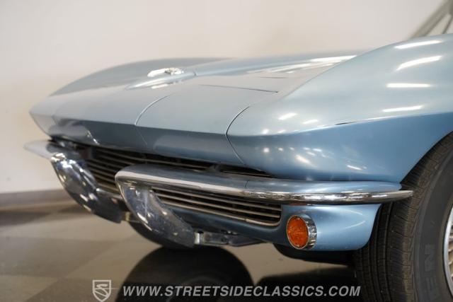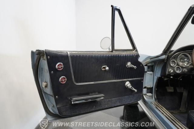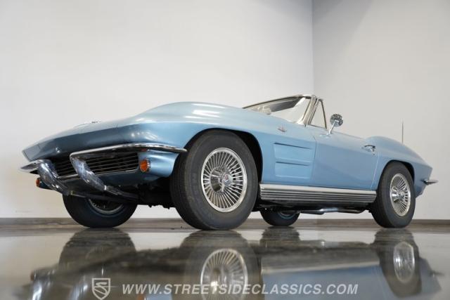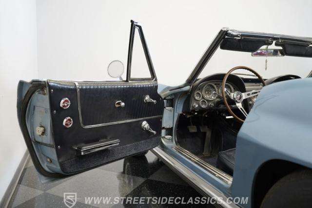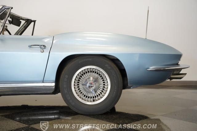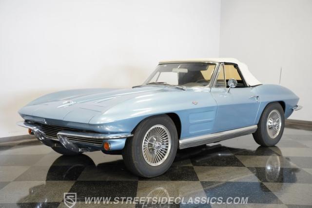Finished in Silver Blue that follows every curve of the legendary bodywork, this 1964 Chevrolet Corvette Convertible represents American performance artistry from an era when muscle cars ruled the streets. Its bold styling features the iconic Stingray design language that revolutionized automotive aesthetics in the early 60s. The sleek profile looks fast even when parked, with distinctive body lines flowing from the aggressive front end to the tapered rear. Chrome bumpers add brilliant contrast against the blue paint while the convertible top folds down for open-air excitement. This American classic rolls on 15-inch factory style knock-off wheels paired with 215/75R15 tires that complete its authentic road presence.
