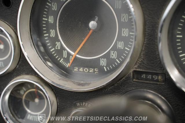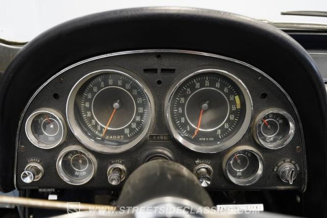 The dark blue vinyl interior creates a focused environment where performance takes center stage. Factory gauges remain functional and legible, providing essential information at a glance. Bucket seats offer excellent support during spirited driving, with the console-mounted shifter perfectly positioned for quick gear changes. Power steering makes this Corvette surprisingly manageable at any speed, while a modern AM/FM radio concealed in the glovebox provides entertainment options for longer drives. The clean dashboard layout, door panels, factory AM/FM and other interior elements maintain the pure sports car aesthetic that made these Corvettes automotive legends among performance enthusiasts.