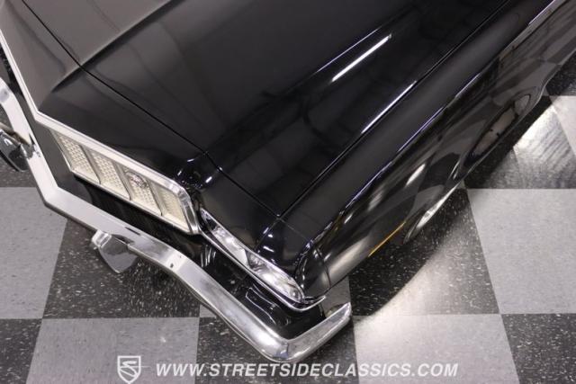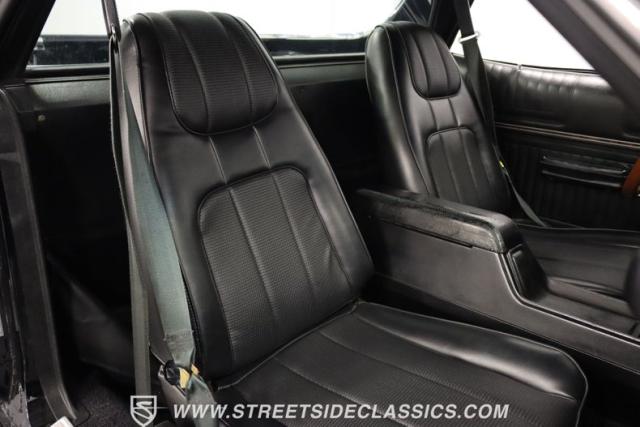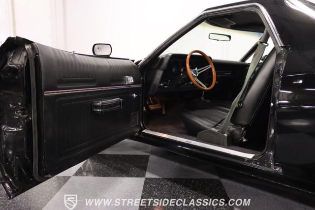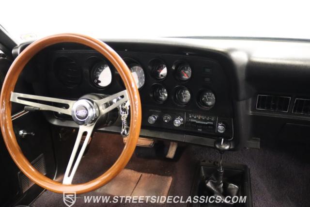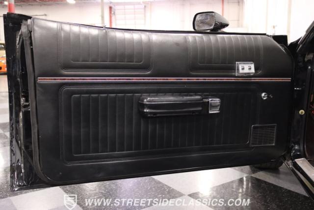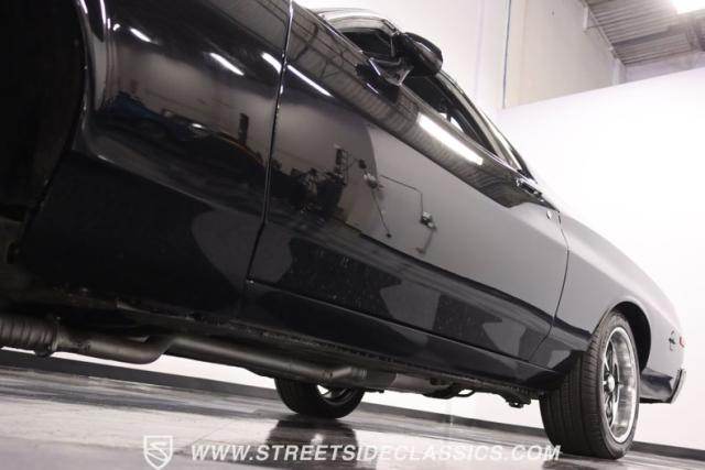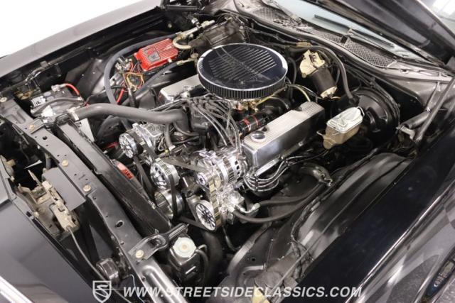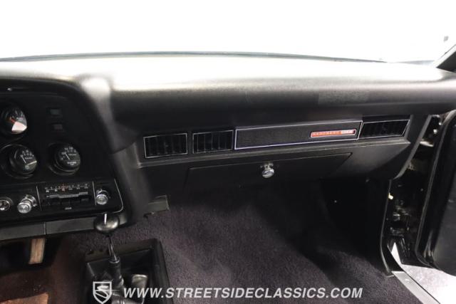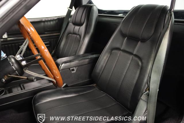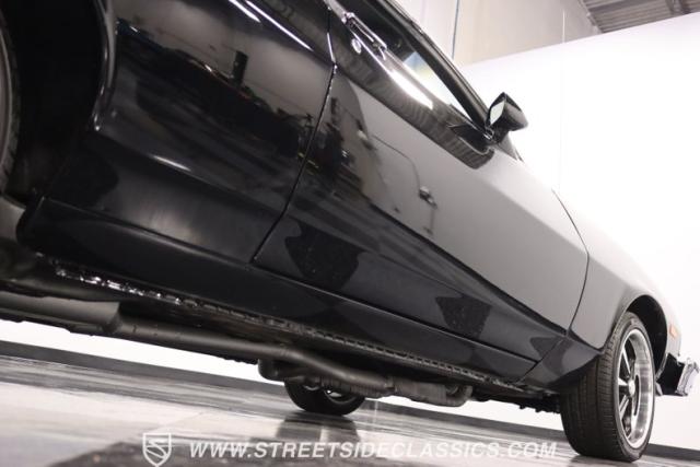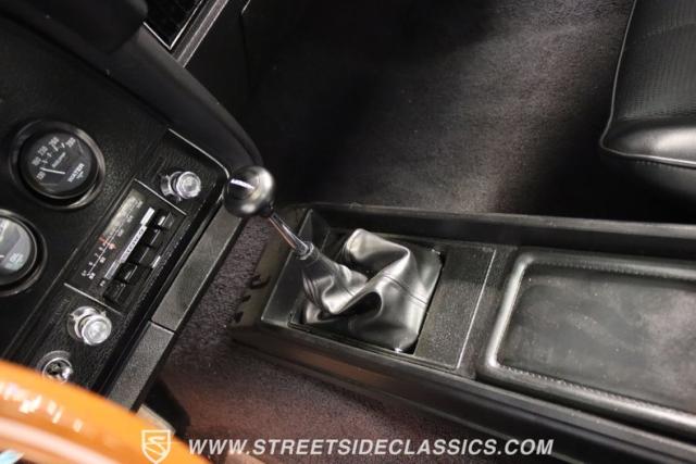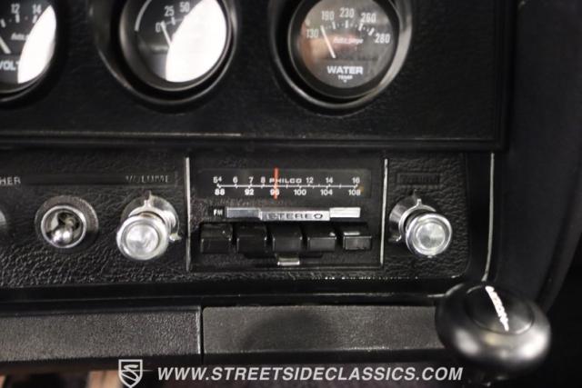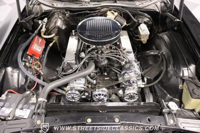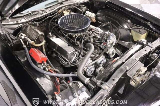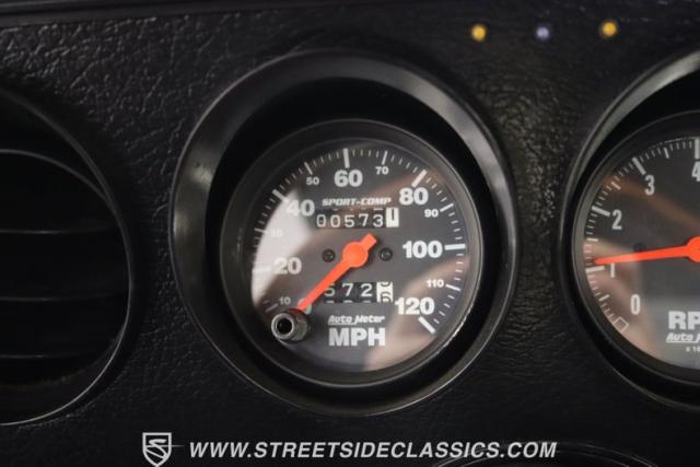 Inside this Black Beauty, the black vinyl bucket seats cradle you, providing both support and style. The dashboard, a carefully orchestrated layout of aftermarket gauges, feeds you vital information with a glance. The Lokar shifter operates with a simple flick of the wrist and above, the black headliner provides a perfect complement to the well-maintained carpet below. Power windows make for a breezy drive, while the steering wheel, adorned in rich wood grain, is accompanied by a stock AM/FM radio ready to provide the soundtrack to your journey, with air conditioning maintaining the perfect climate.