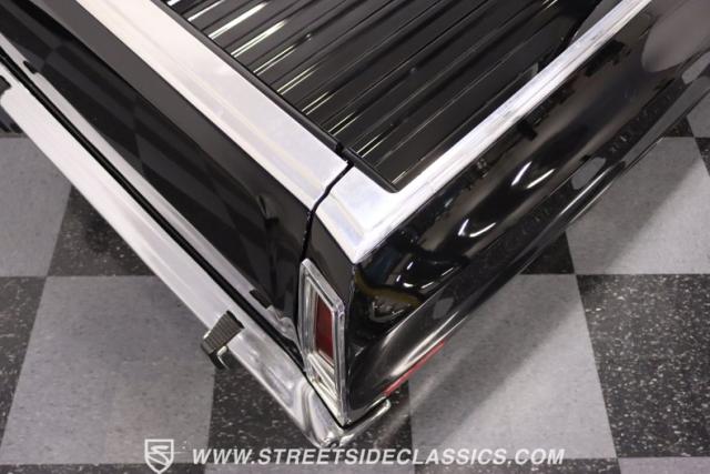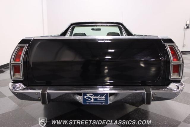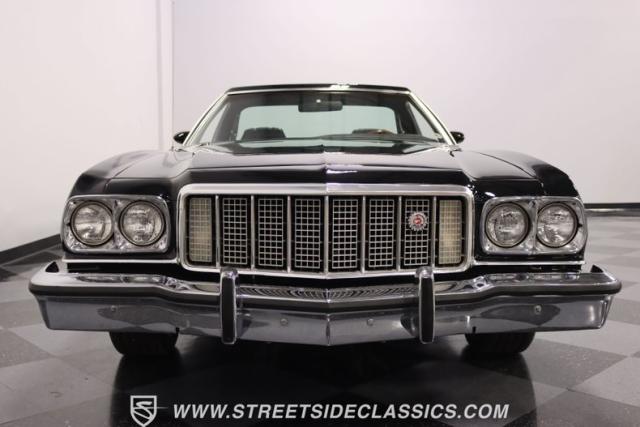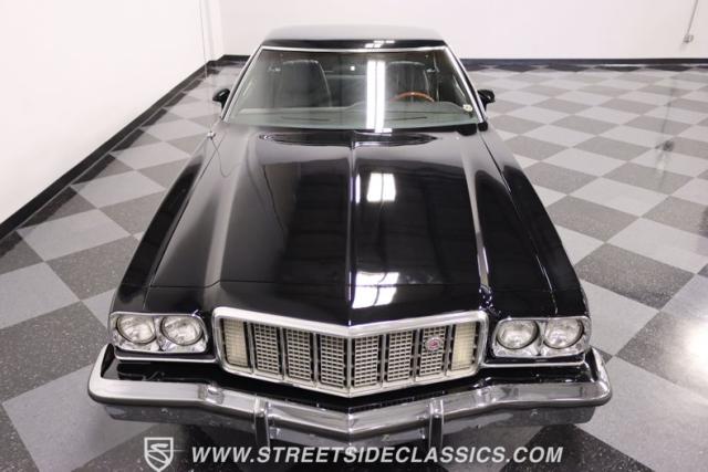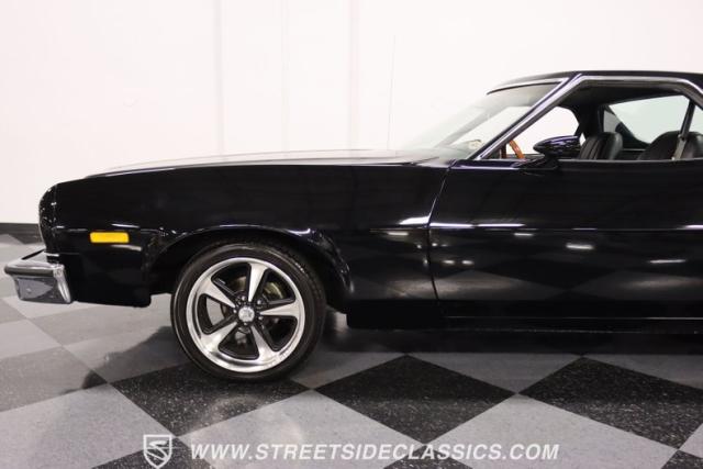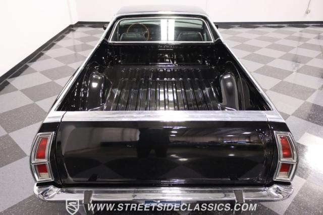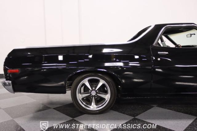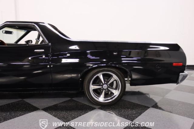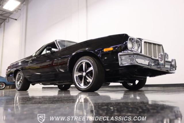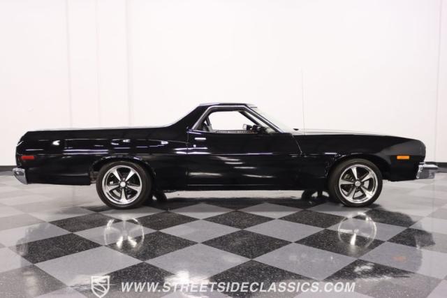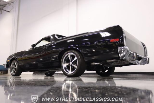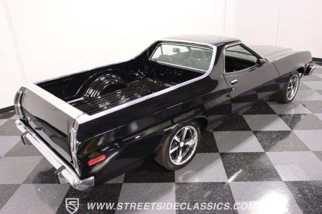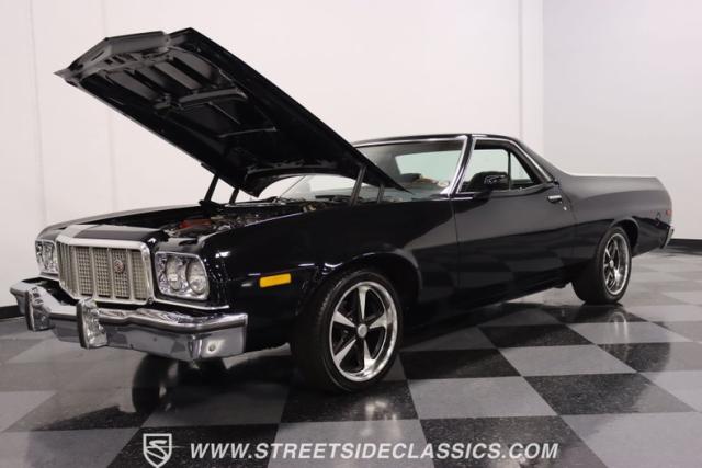 This 1976 Ford Ranchero GT is American muscle, reengineered with a thunderous 400ci V8 engine. Cloaked in dominating black, its exterior is a declaration of power, polished to a shine that commands attention. Mounted on 18\" U.S. Mags, this machine is a fusion of raw strength and unapologetic attitude, enveloped in Yokohama tires ready to conquer the asphalt. The chrome bumpers and grille, unblemished and bold, enhance the Ranchero\'s aggressive stance.