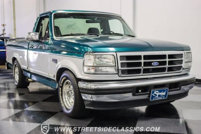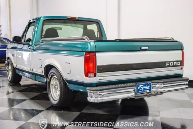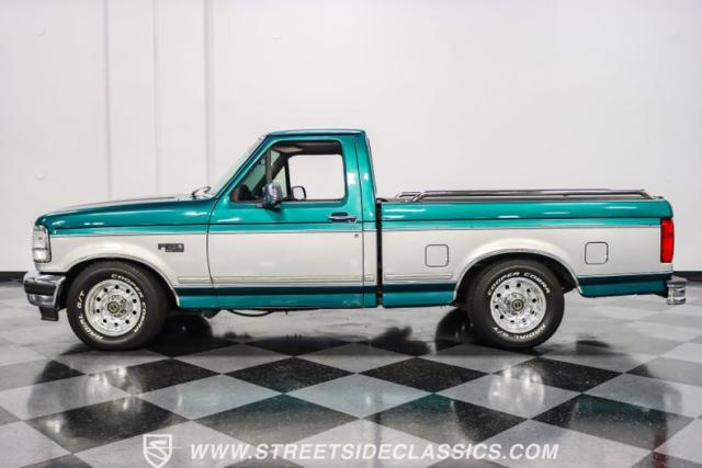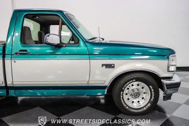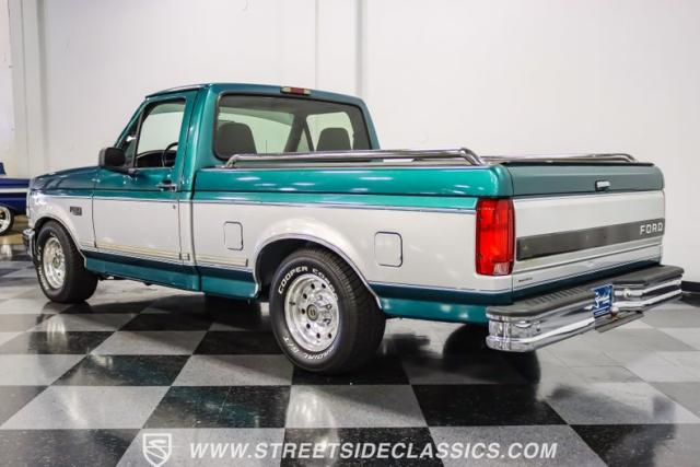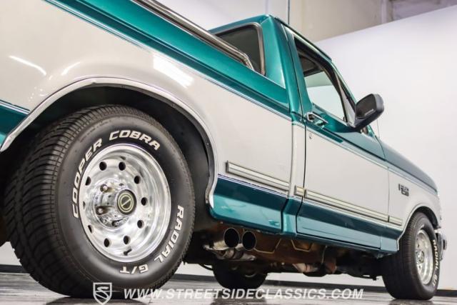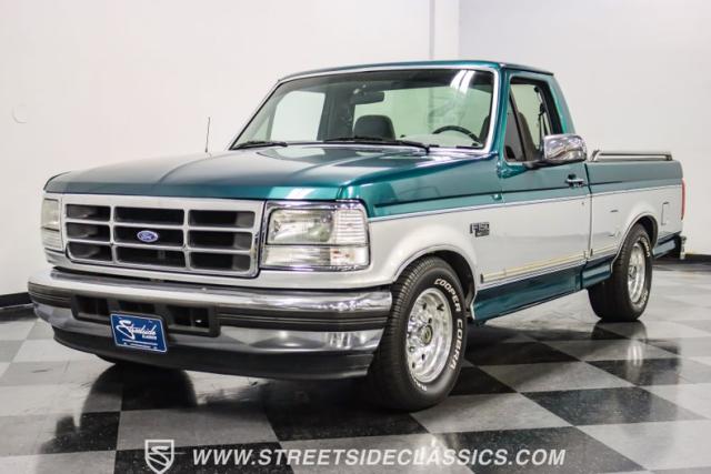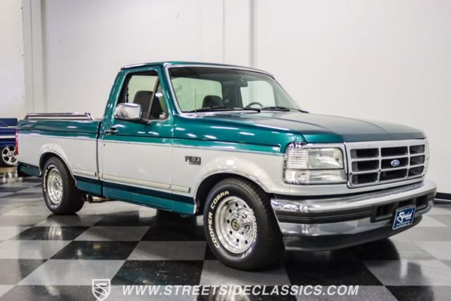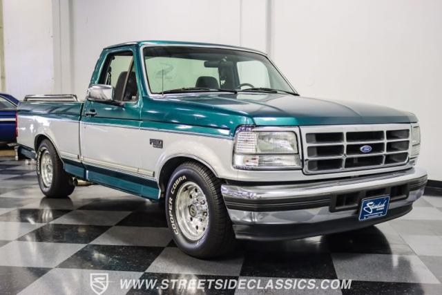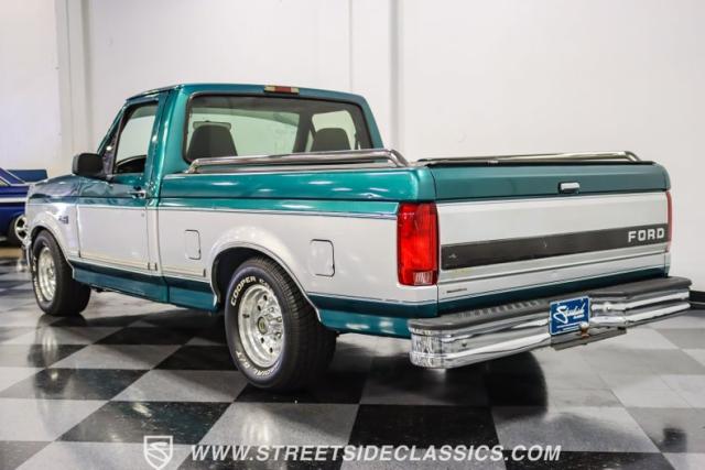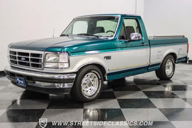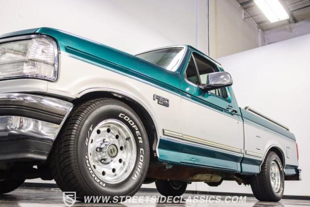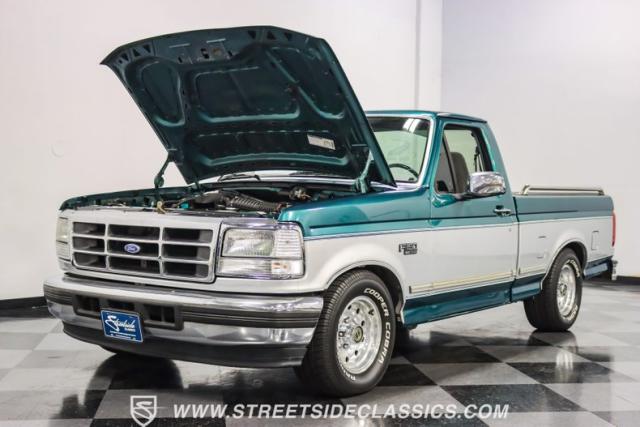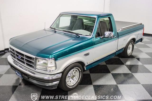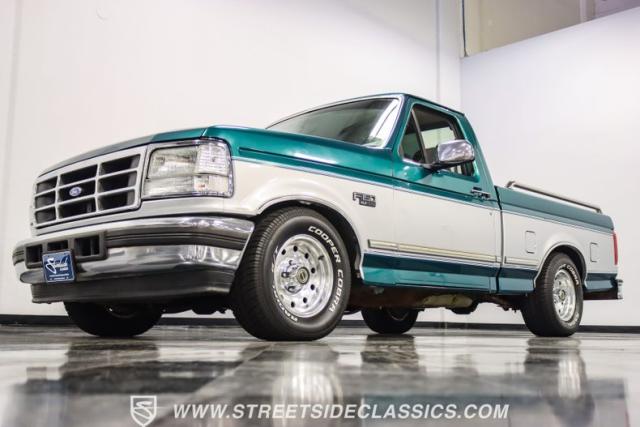 This 1996 Ford F-150 XLT showcases a Pacific Green Metallic paint job with silver accents, embodying the rugged spirit of mid-90s American trucks. The lowered stance and dual exhaust give it an aggressive edge, while the chrome side bars and tonneau cover add practicality and style. Rolling on 15\" alloy wheels wrapped in beefy 275/60R15 Cooper tires, this F-150 is ready to tackle any road with confidence.