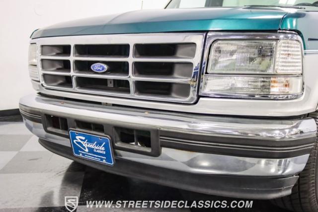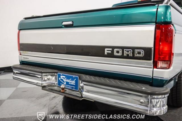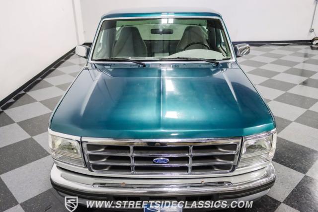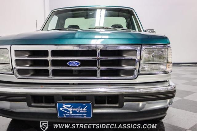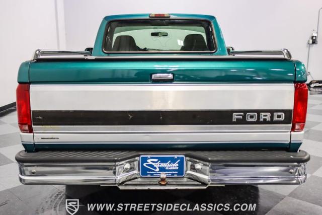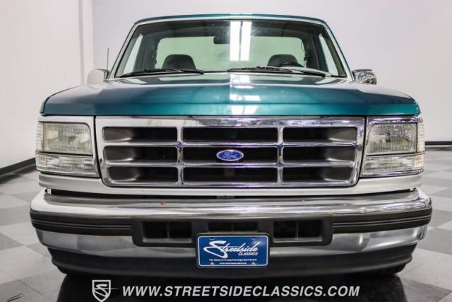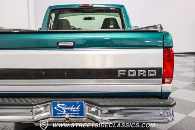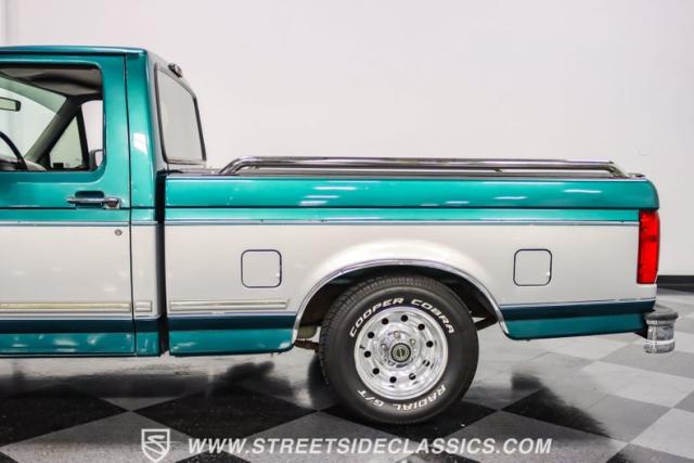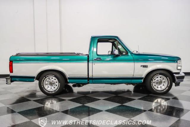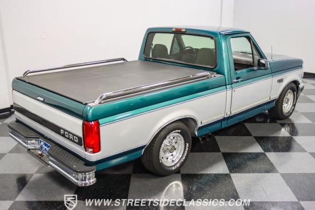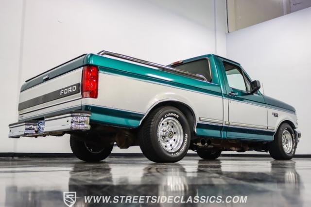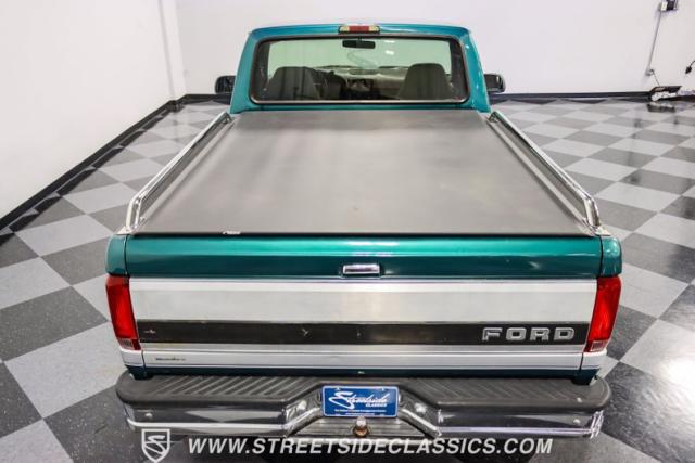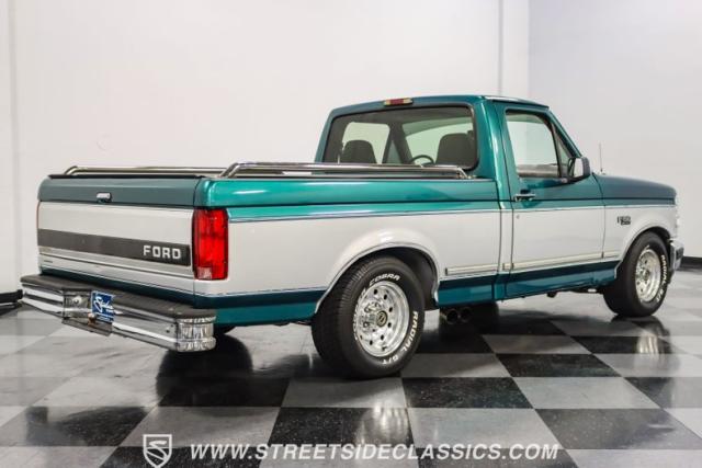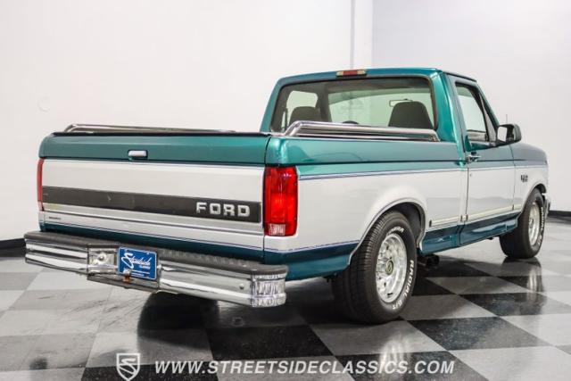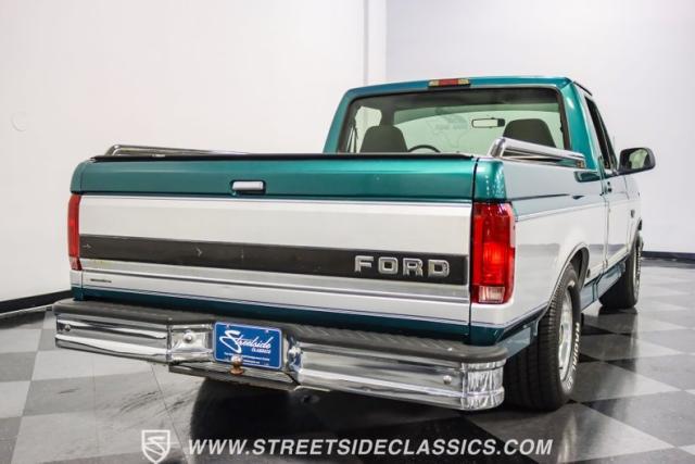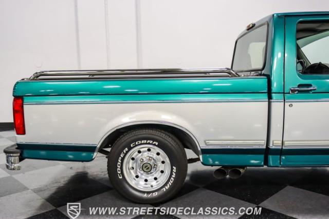 This 1996 Ford F-150 XLT showcases a Pacific Green Metallic paint job with silver accents, embodying the rugged spirit of mid-90s American trucks. The lowered stance and dual exhaust give it an aggressive edge, while the chrome side bars and tonneau cover add practicality and style. Rolling on 15\" alloy wheels wrapped in beefy 275/60R15 Cooper tires, this F-150 is ready to tackle any road with confidence.