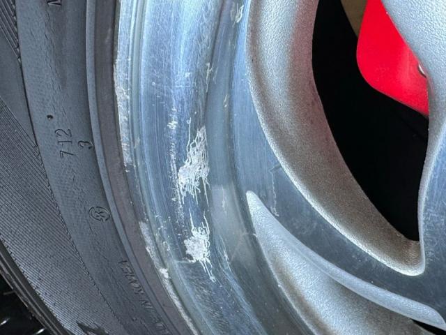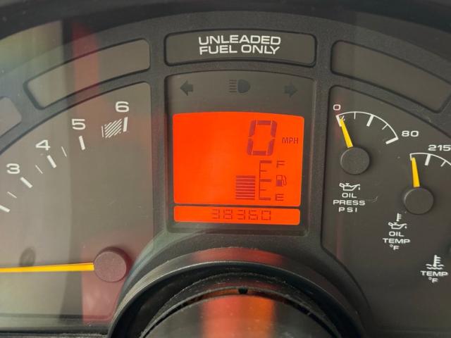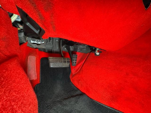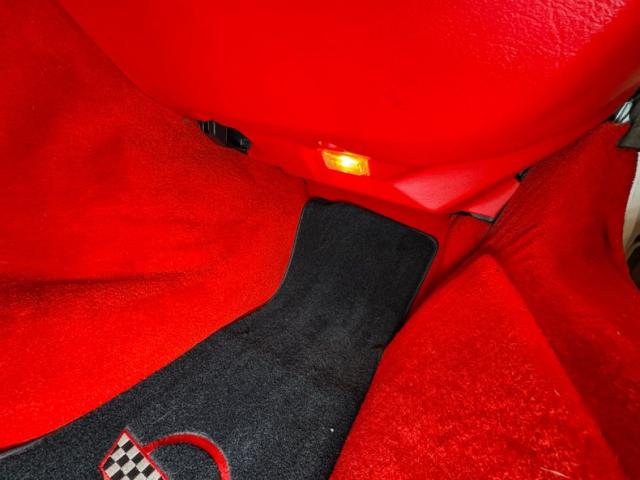 Attractive two tone doors insert a black panel with switchgear between red, presenting cleanly greet us upon opening the doors. Step over the carpeted door sill and into the sport leather bucket seats in red, with the driver seat showing some significant wear with faded creases and edge fade, the passenger seat to a much lesser degree. The thick sporty steering wheel holds an airbag under the Corvette embossed logo leading to the dome shaped gauge cluster with rising tachometer, descending operational gauges, and the speed displayed digitally on the orange backlit center screen. A dark panel of idiot lights is in the center stack above the push button A/C panel and an aftermarket AM/FM/CD radio with AUX, Bluetooth, and USB. A clean center console holds the shifter and seat controls while red carpet blends visually with the red lower dash and is protected by black carpeted mats. The rear cargo area is also a mix of red carpet and black mat and presents cleanly.