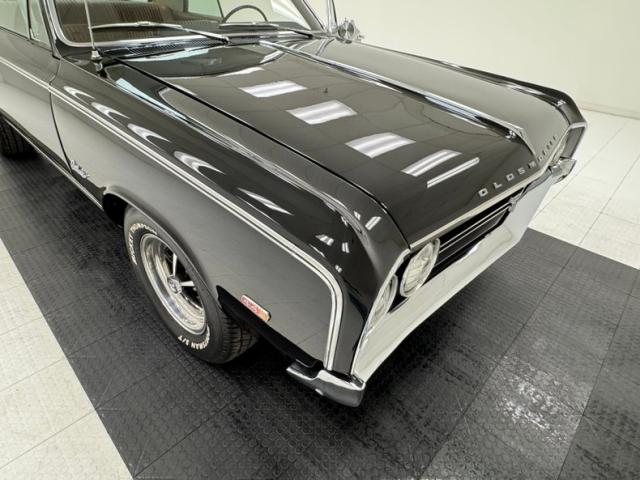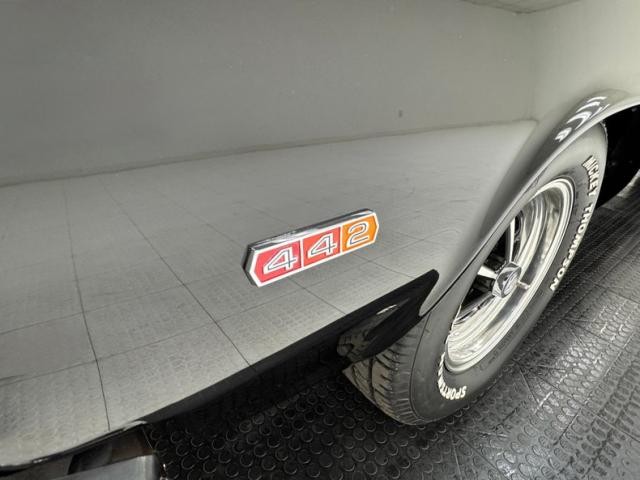 The gentlemen\'s muscle car begins with 60\'s era sharp angles and spectacular two stage Ebony Black paint intersected by polished stainless trim on the side, rocker panel, centerline of hood, and around each window. A coveted splash of color is reserved for the three section 442 emblems on the fenders and rear decklid. A chrome bumper underscores the symmetrical rear fascia with segmented tail lights and an equally divided center trim piece with enough segments to spell out OLDSMOBILE. Up front, the face has GM familiarity to it, and an F85 badge is centered on the horizontal rakes of the grille. 15-inch Magnum 500 wheels complement the exterior with black inserts and are wrapped in staggered tires with a mid 2023 date code. The exterior is as nice as they come with the only imperfection being some minor scratches on the molding trim.
