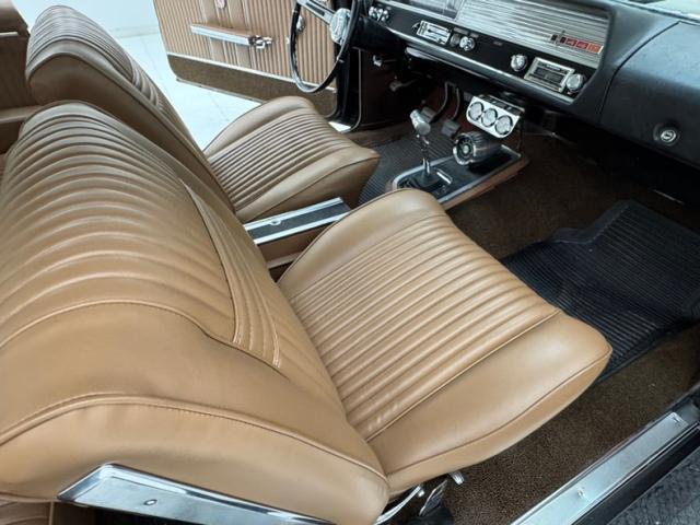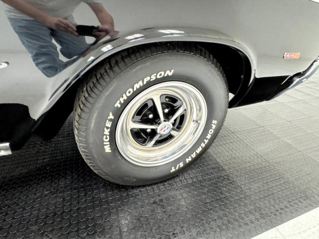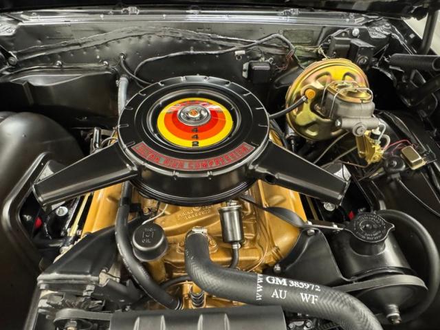 The show stopping quality continues under the hood where you\'ll find the gold blocked 330ci V8, rebuilt in 2024 when it was bored .030 over and recipient of a Racer Brown camshaft. Originally rated at 310 horsepower, it\'s mated to a 4-barrel carburetor and a 4-speed Muncie M20 manual transmission. Out back, you\'ll find a 12 bolt with 4.11 gears and Positraction. Power steering and power brakes are evident in the clean bay where the bull\'s eye decal on the air cleaner exhibits the classic 442 colors.