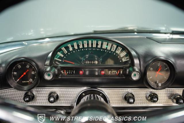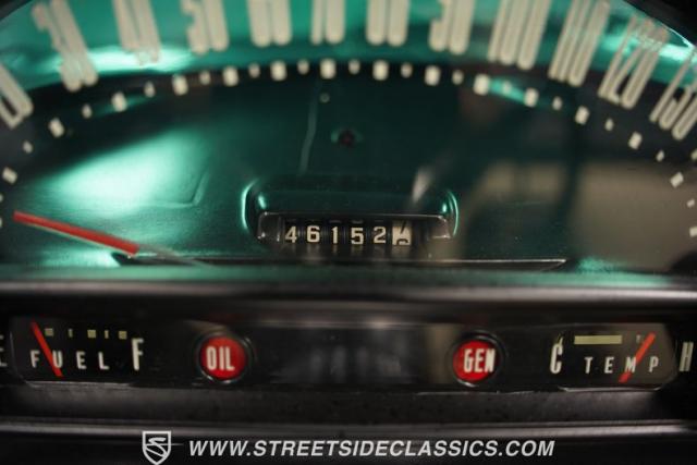 Under the front-hinged hood, we find a period-correct 312 cubic-inch V-8 engine sporting a Y-Block and two-bolt main caps. A single four-barrel carburetor feeds that small block V-8, while a stock-style exhaust manifold and dual exhaust do away with spent gasses. Power is then sent through a two-speed automatic transmission before being sent to the fifteen-inch rear wheels, where 205/75R-15 whitewall tires wait to put it to the pavement.