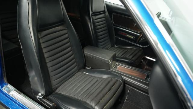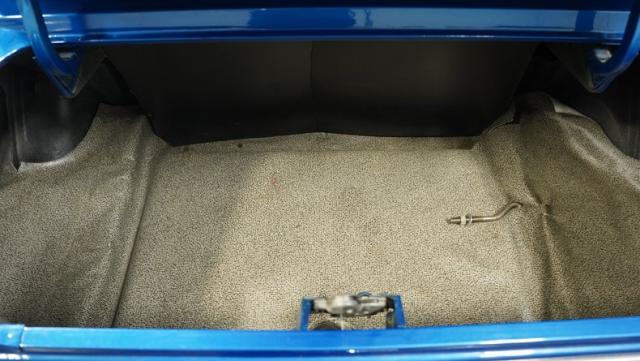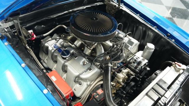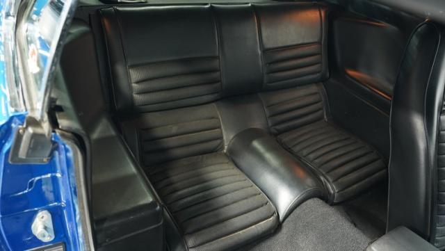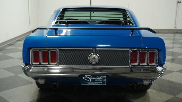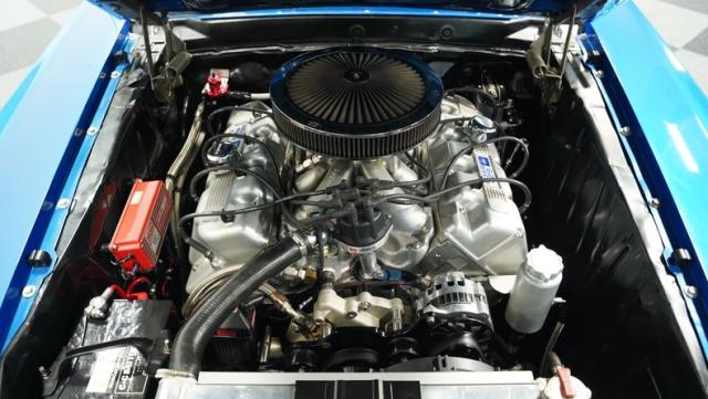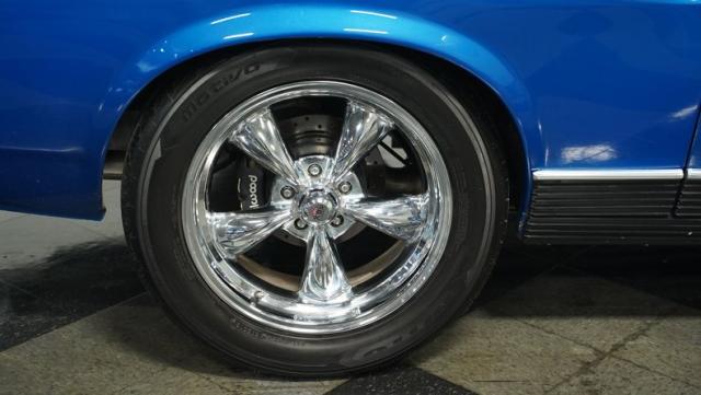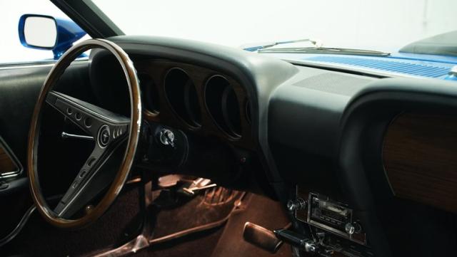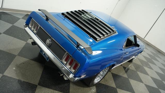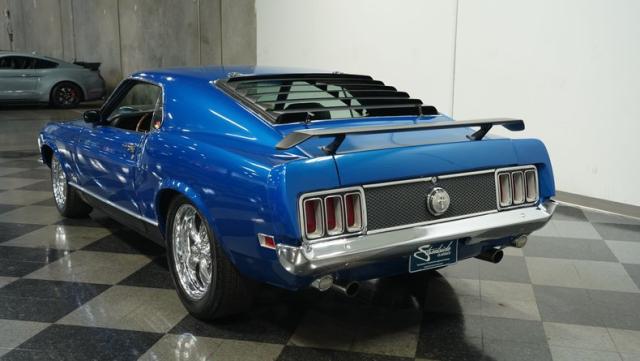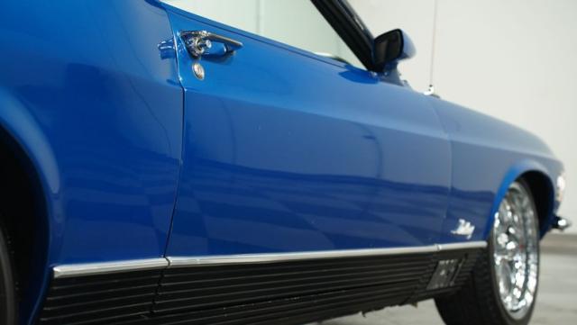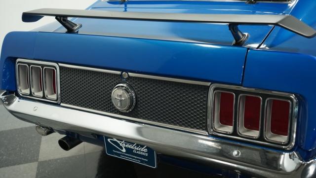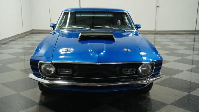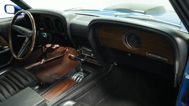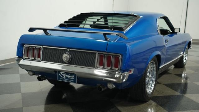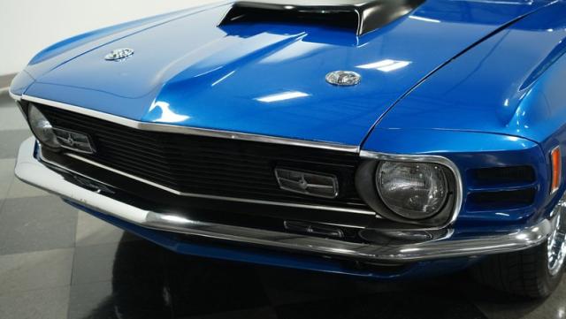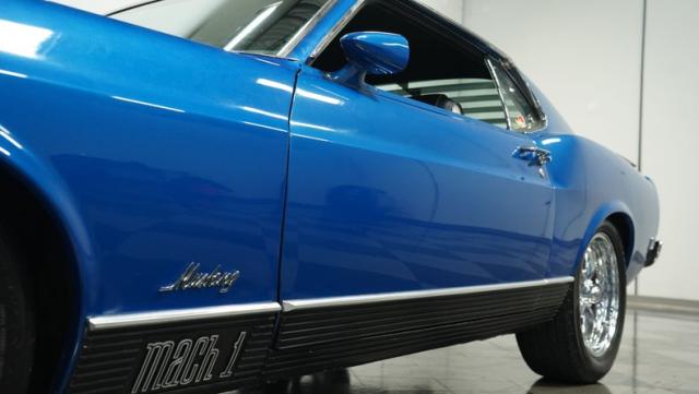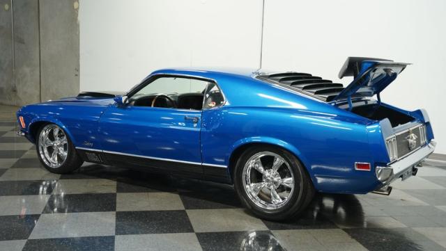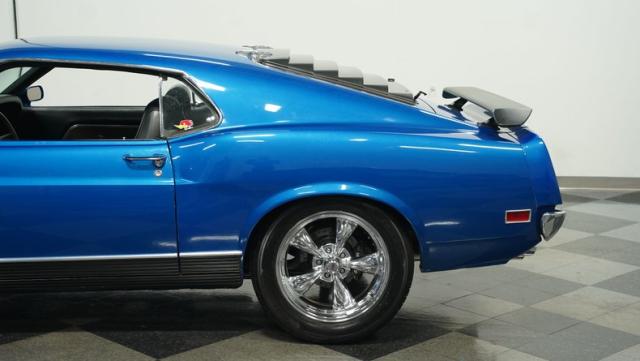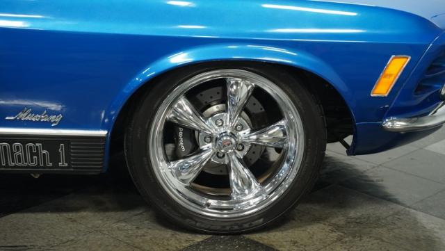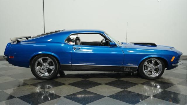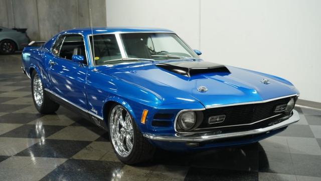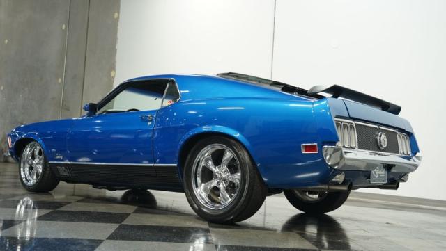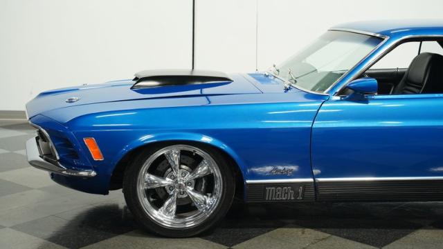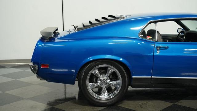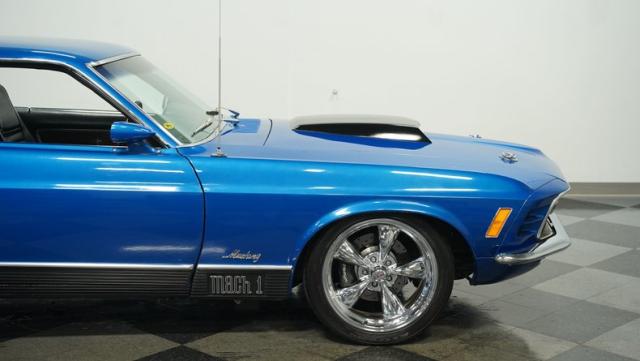 Blazing in Bonzai Blue Metallic, this 1970 Ford Mustang Mach 1 Restomod immediately captures attention with its striking color and aggressive stance. Equipped with a factory-style scoop and hood pins, this classic muscle car retains its iconic look, enhanced by aftermarket chrome wheels and a lowered stance. The 18\" Rev wheels wrapped in 225/45R18 tires at the front and 245/55R18 at the rear ensure that it grips the road firmly. Rear louvers and a Mach 1 wing add to its period-correct aesthetic, completed with a nod to its heritage through chrome accents and meticulously maintained trim, ensuring it stands out on any road.