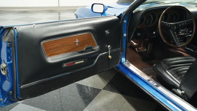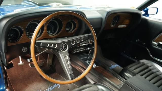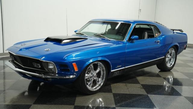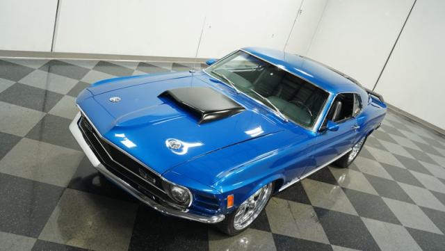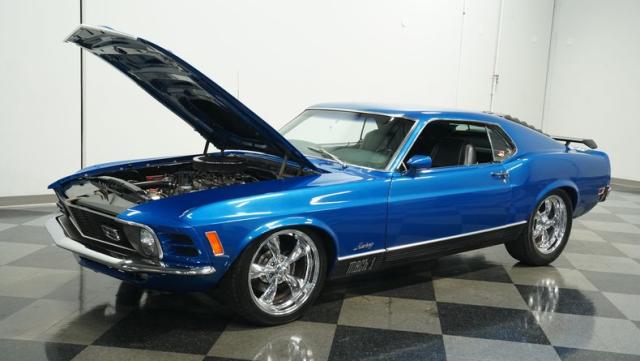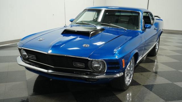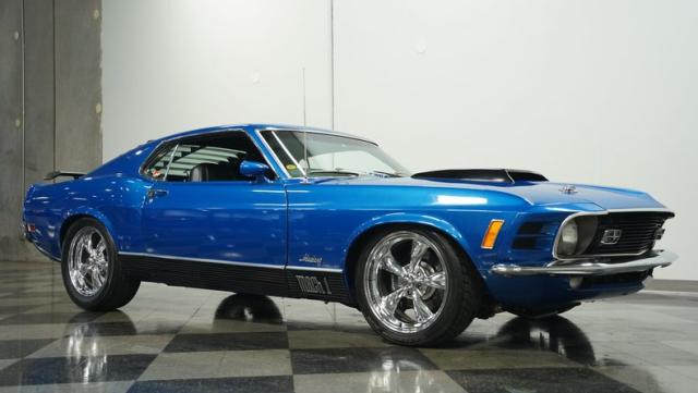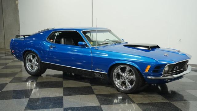 This 1970 Ford Mustang Mach 1 Restomod offers a blend of classic style and modern performance with its powerful 521 V8 engine, stylish black interior, and striking Bonzai Blue exterior. Don\'t miss your chance to own this exceptional muscle car. Call today!