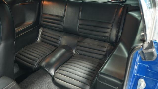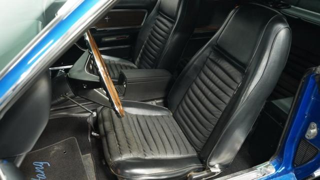 Inside, this Mustang\'s cabin is an inviting blend of vintage style and modern touches. The black vinyl bucket seats offer both comfort and classic style, complemented by a floor shifter and center console that keeps the driver in command. The dashboard houses a full gauge cluster, providing clear and precise information at a glance. The AM/FM cassette stereo ensures your favorite tunes accompany every journey, while the detailed trim and panels maintain the authentic look and feel of this iconic vehicle. The black interior theme is consistent throughout, creating a cohesive and stylish environment.