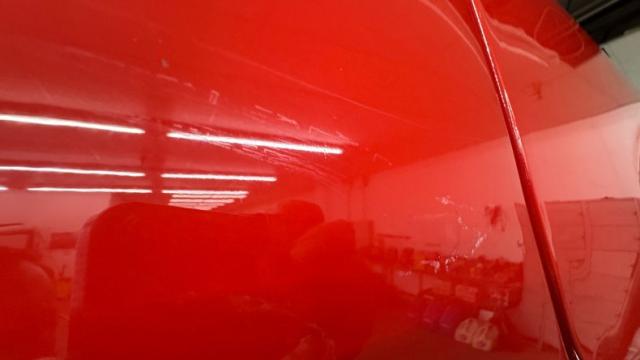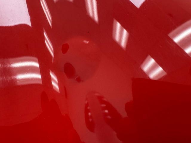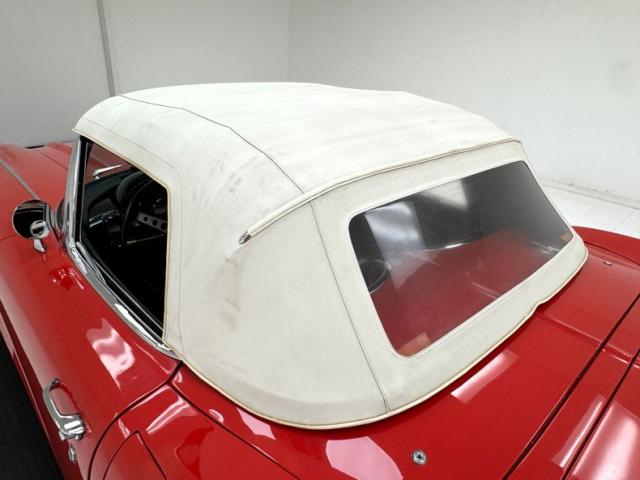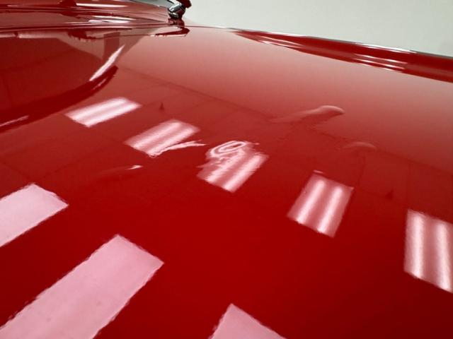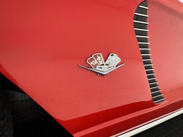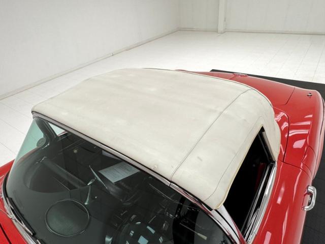 Red was often used to show military force in the Roman empire, so Chevrolet dubbed one of their reds as Roman Red, as seen on this car. The dual headlights set in the sculpted fascia are accentuated by chrome spears that run between them and along the fender top. At that point, the wrap-around windshield takes center stage, while in profile, the car exhibits the first year of the body colored cove rather than a contrasting color, and it\'s fronted by a slanted vent and crossed flag emblem. The monochromatic coverage is especially appealing on the back end where four tail lights are embedded and blend with a chrome bumper with decorative rings and like all them brightwork on the car, is in very nice condition. A white canvas soft top is also in good shape with some typical light hazing of the plastic and faux knock offs covering the 15-inch wheels. Imperfections include some light scratches, sizable bubbles on the hood, random chips, scuffs, faded paint on the crossed flags, and a blemish on the white canvas.