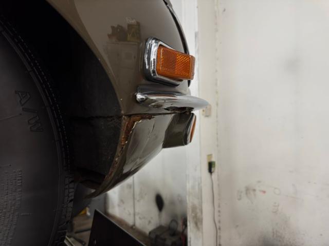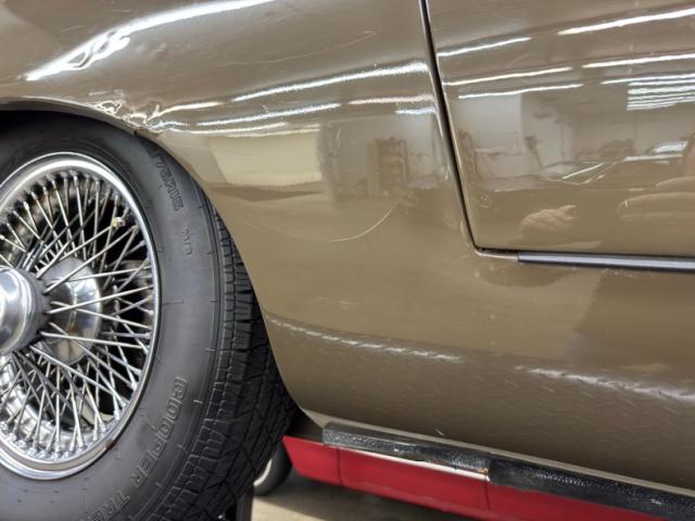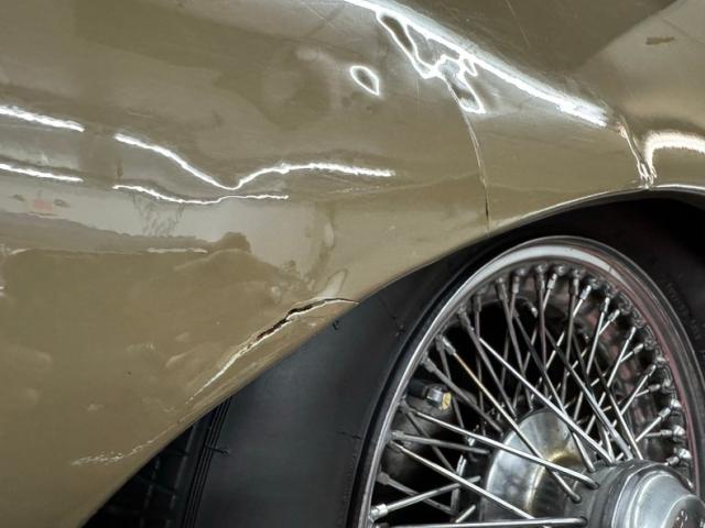 A sort of green toned brown coats the legendary lines of this big cat and is aptly named Ascot Fawn. The inset headlights and gaping mouth at the front end of the long nose, is iconic as it is epic and in nice condition with surface rust and bowing of the center emblem housing on the grille as well as on the bottom side of the crossbar. The louvers on the hood add the right amount of sportiness to the grand tourer and the 15-inch chrome wire wheels carry the class end of things, here showing some patina and peeling of the plating. The twin tailpipes extend past the rear bumper and flank the license plate and in profile, the spectacular long nose is accompanied by the high sloping rear section, long before the Porsche Panamera was dreamed up to accommodate rear passengers. Scuffs on the chin, less than perfect metal trim, uneven and cracking filler on the rear valance and numerous other places, gap imperfections, scratches, rust bubbles and some rust causing paint peeling all make our list of exterior flaws.