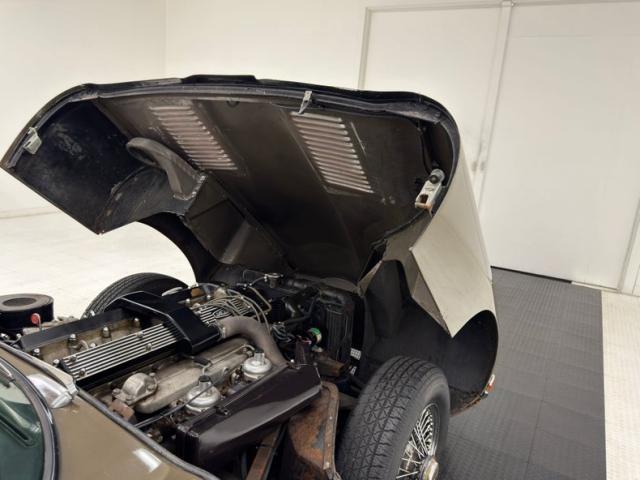 The entire nose pivots forward to reveal a clean 4.2 liter DOHC inline six cylinder with 2 Su carburetors and a rating of 245 horsepower. It is mated to a 4-speed manual transmission sending power to the rear axle and 3.54 gears.