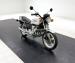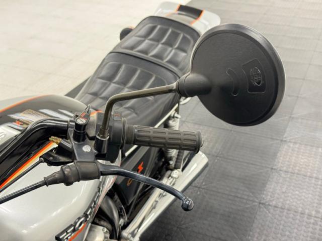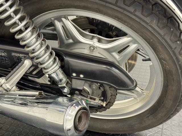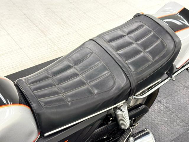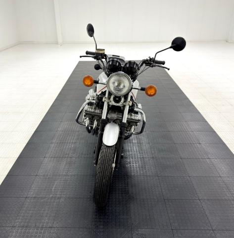 Approach this bike from the side, and its compact and well designed profile will impress, here with a silver painted tank and apron augmented by a red and black pinstripe, picked up by the red X of the model emblem on the side. The front fender is silver and the rear, what\'s visible, is black which coincides with the bold black racing stripe on the tank and apron. Move towards the front of the bike, and your attention will be drawn to the six, yes six, chrome headers emitted from the wide engine that extends well past the forks on each side and is protected by a crash bar, also chrome. The black vinyl seat has room for two and is in very nice shape while five spoke wheels, 19-inch front, 18-inch rear, are fittingly sporty for this bike.
