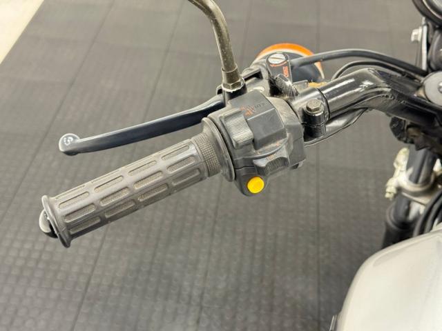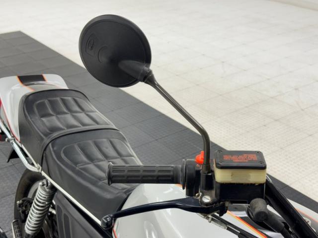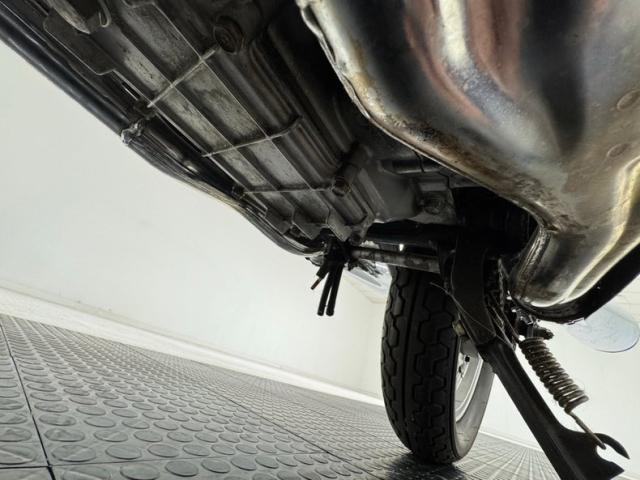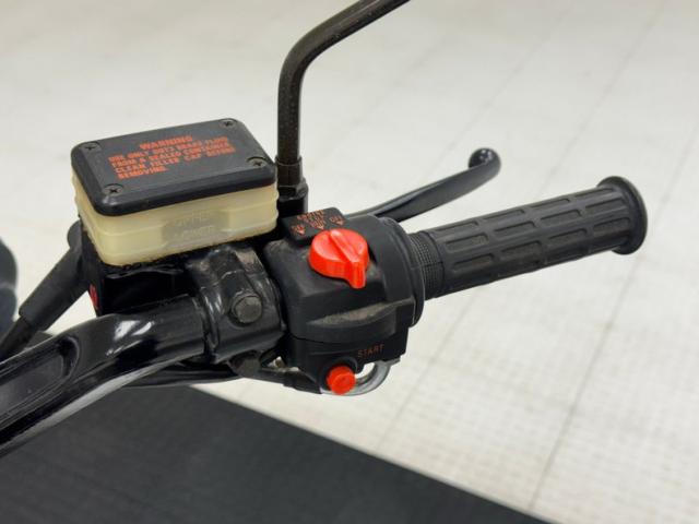 Plastic housings holds the switchgear on the handlebars with some slight patina and faded embossed painted lettering, while multi colored buttons and toggles help keep them distinguished. Textured rubber grips hold black clutch and brake levers next to black mirror posts and housing. Red shows up again in the numbering on the speedometer, odometer, and ammeter, all encased in the same housing along with colorful and labeled indicator lights, a little dusty but fully intact and complete.