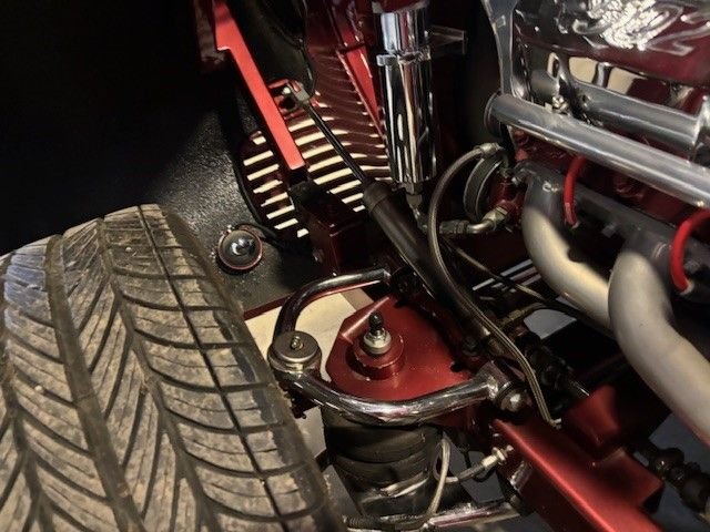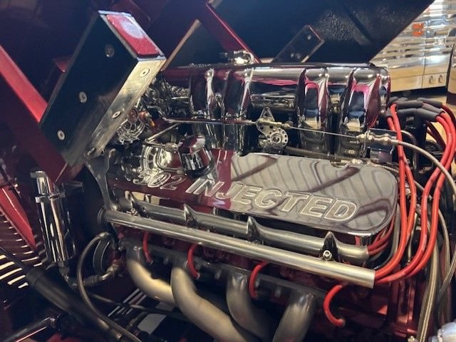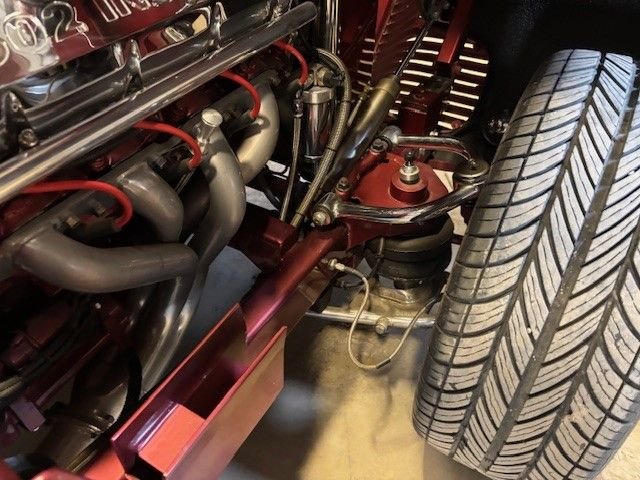 One piece Hydraulic Front clip, all new glass, hand built rectangular tube chassis, TCI front mustang two style front suspension with chrome A arms, power rack n pinion, chrome coil overs, Ford 9 inch with TCI four link chrome with Alden coil overs, and 12 inch Wilwood brakes.