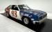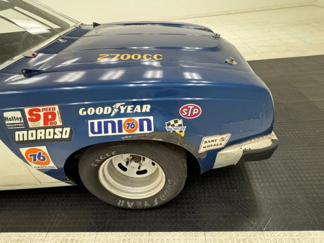 AMC used the red, white and blue motif to decorate their high performance and race cars as an ode to the United States and this car wears those colors along with some typical decals, racing numbers, and hand painted sponsor and driver name. There are no lights and the grille has been replaced with a screened unit that keeps track debris out while three hood pins keep the lid on the car and an aluminum wing keeps the car grounded. It\'s got plenty of bumps and bruises and some patchwork using riveted aluminum pieces, keeping things light. The 13-inch wheels carry racing tires, the windows are plexi, and the gas filler has been moved up closer to the C-pillar.