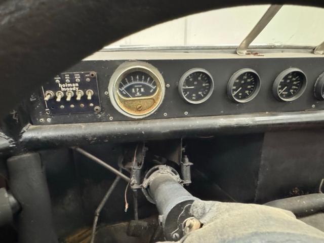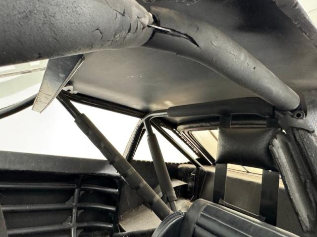 Pure race mode on the inside with a full roll cage, bare metal floors, a single bucket seat, and a padded 3 spoke steering wheel. The dash board is basic with a Holman Moody toggle panel and five gauges. The shifter is on the transmission hump and retains its boot which keeps dirt out of the linkage. Surface rust is noted in the footwells and on the gas tank in back while the rest presents with fitting patina.
