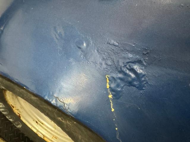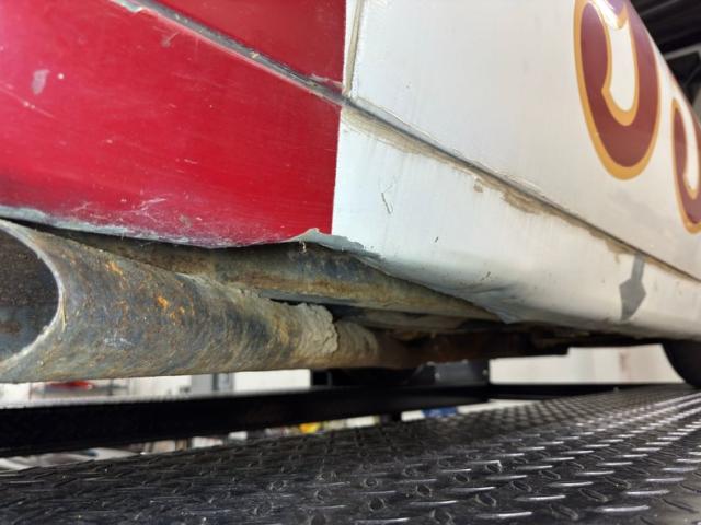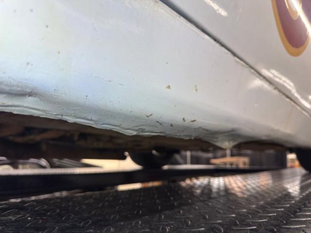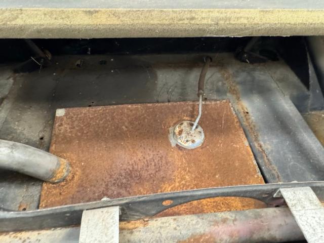 Lots of surface rust, corrosion and mud on the bottom but everything seems to be intact. Disc brakes are on front and drums in back while the single exhaust is not impeded by a muffler and exits to the side. Suspension consists of coil springs in front and leaf springs in the back.