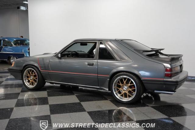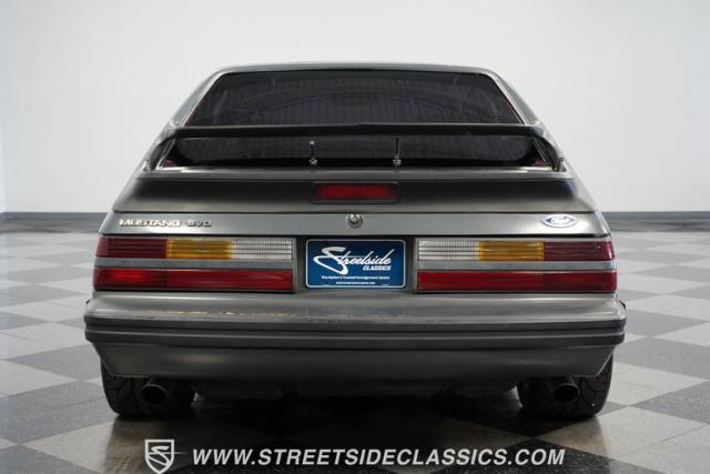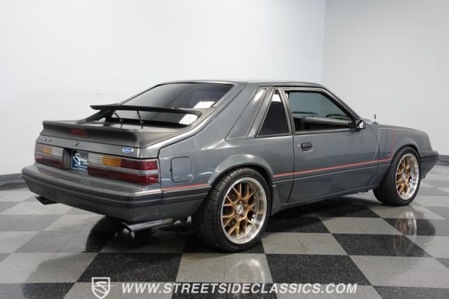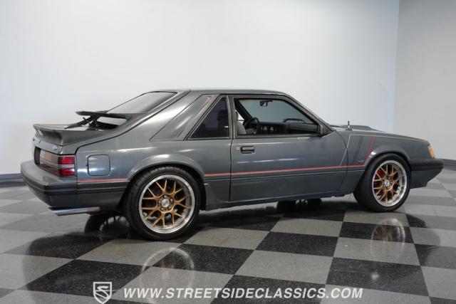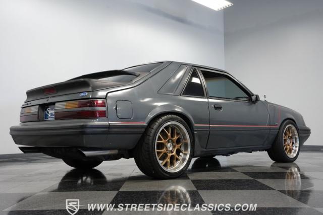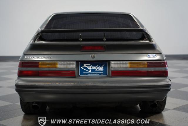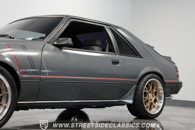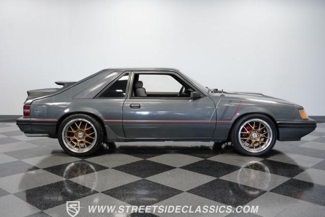 This 1986 Ford Mustang SVO is one of only 3,382 produced in its final year. The gray fox body showcases flush headlights, a distinctive feature of later SVOs, and the rear spats and dual wing that set it apart from standard Mustangs. Custom pinstriping adds a unique touch, giving this Ford performance icon a personalized edge. ADR 18 wheels wrapped in meaty 255/40ZR18 front and 275/35ZR18 rear tires provide an aggressive stance, emphasizing the SVO\'s performance pedigree.