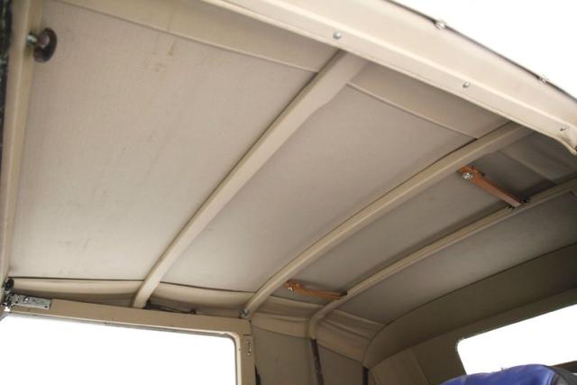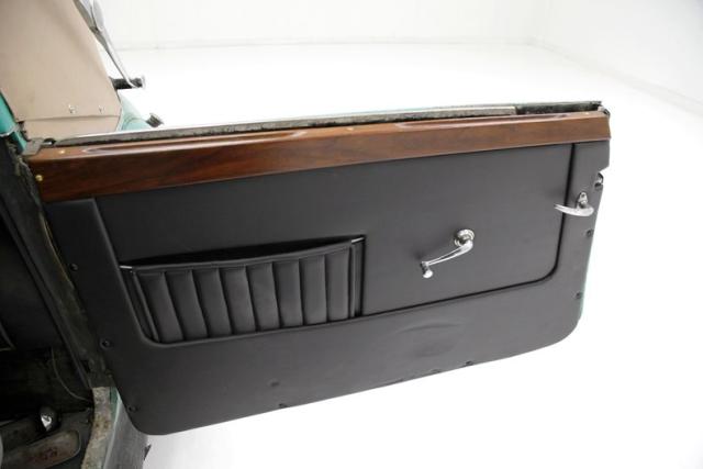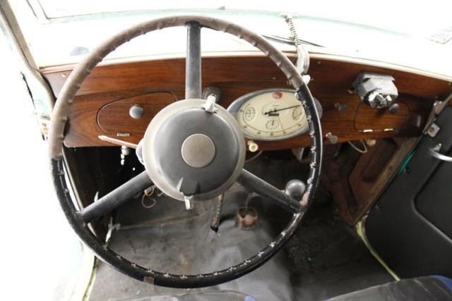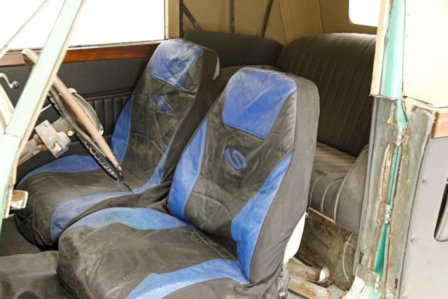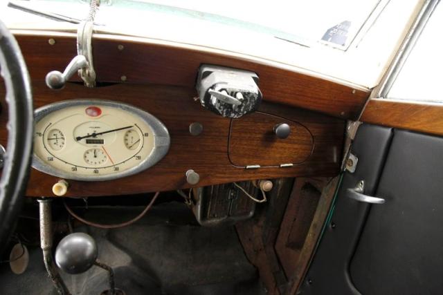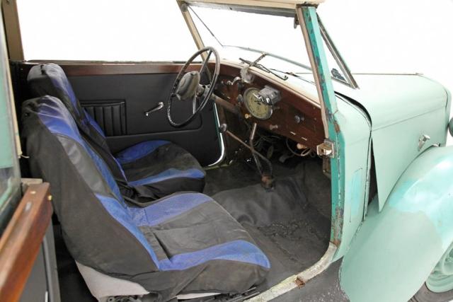 A swing of the suicide door and it appears a restoration has begun on at least the door panels. New wood sills and black vinyl panels have been put on and look fab! The remainder of the interior includes low back bucket seats, a restored and newer but dusty back seat, a wood dash which has also been restored, and rubber floors whose underpinning integrity are questionable. The factory large round plastic steering wheel is on and the central oval gauge cluster is intact and looking great. SO restoration has indeed begun and what was done is very nice.