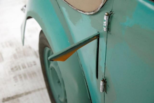 Emulating most cars of the time, this mini Minx version of the Hillman Drophead coupe still has plenty of straight metal with curved fenders and small flared rocker \"running boards\". A cowled hood with a mesh metal V shaped grille is flanked by a single round headlight on either side and a split slightly curved bumper below. The steel shows plenty of patina with peeling paint and the passage of time with a very light coating of surface rust. No real invasive rust is noted, so it\'s an excellent candidate for a restoration. Signal lights and their respective bezels are present and will need re-chroming. Suicide hinged doors are on and an interesting feature just behind those doors is a pull out turn signal bar with a light on the end. A tan canvas 3 position top is on and shows some dry rotting and has a landau bar on the back along with a glass window. (Closed, Deville-format half open, and open fully). Other features include a fold out windshield, tail lights and steel drilled wheels. It is also made even rarer due to the fact that it is a left hand drive car, which none others are known to exist. Sharpen your sandpaper and test the spray gun. I feel a piece of history coming to life!