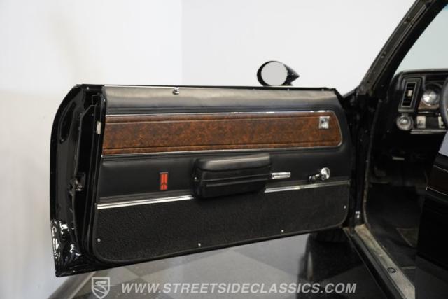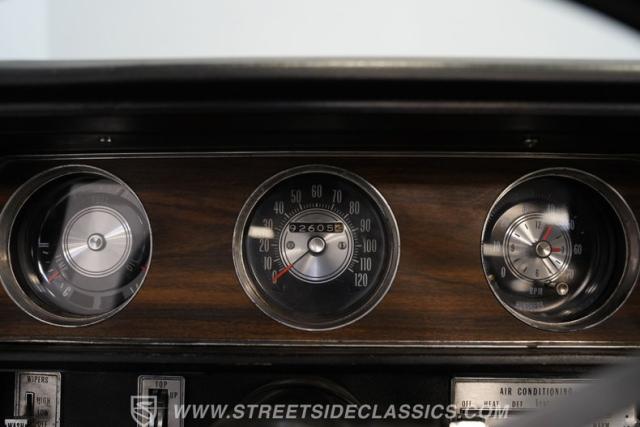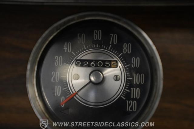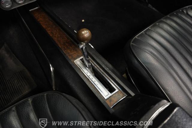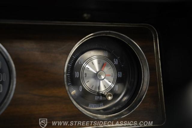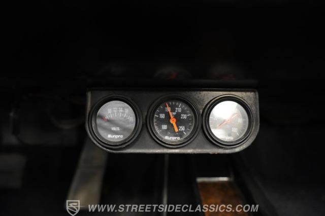 The black vinyl interior may show some wear, but considering it remains in its original configuration, it appears pretty well-preserved. The front buckets have retained their shape and they straddle a center console that\'s free of any glaring cracks or blemishes while positioning the shift lever within easy reach. Up front on the dash, a trio of aftermarket gauges take their place alongside their factory counterparts to keep tabs on motoring functions. The woodgrain accents inside the cabin, often one of the first areas to show excessive wear, are also still looking good. You\'ll find a factory-correct AM radio still in place at the center of the dash, although it will need a bit of attention to get back online.