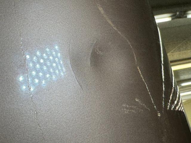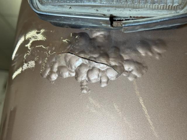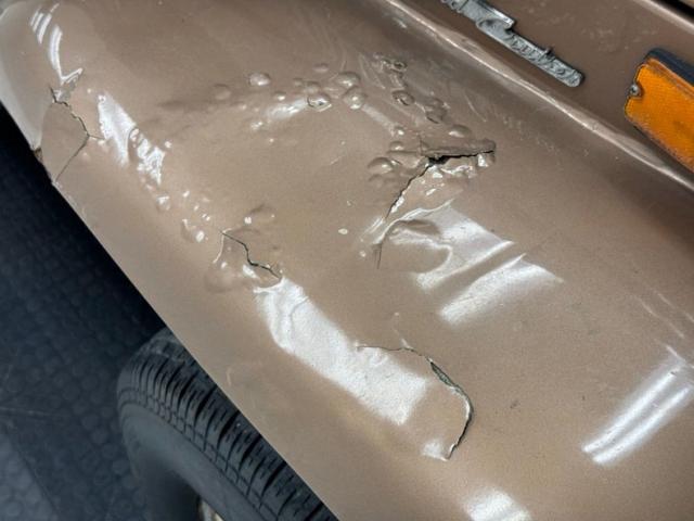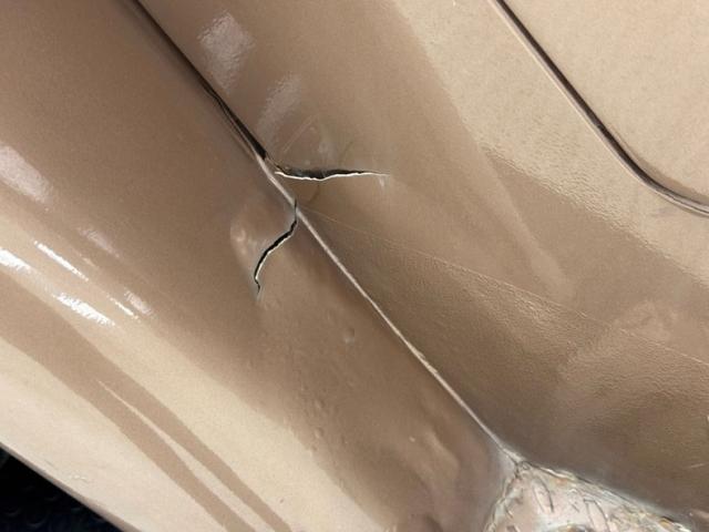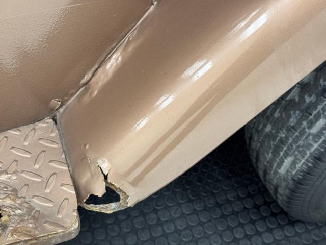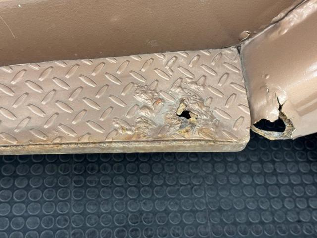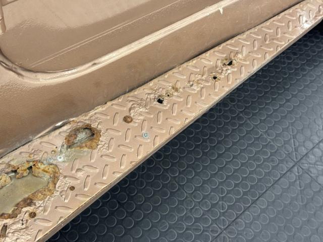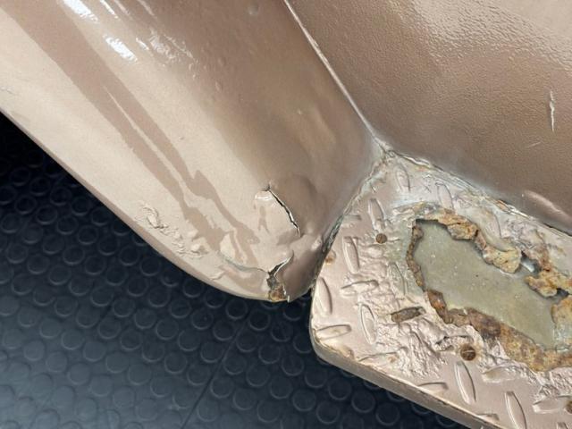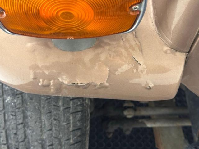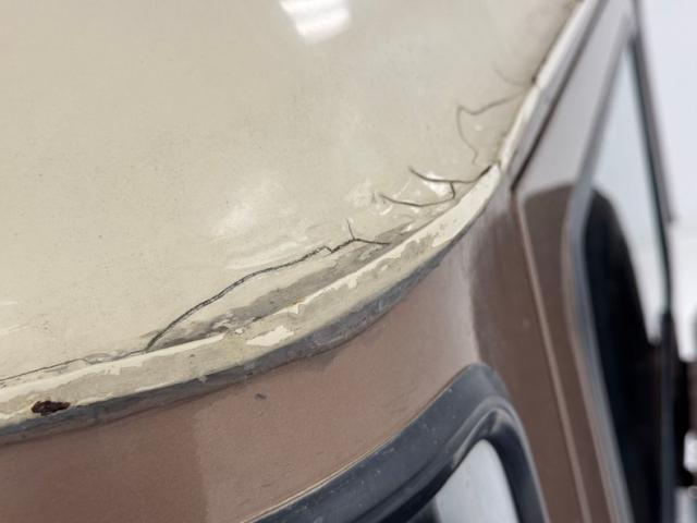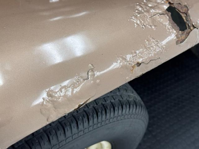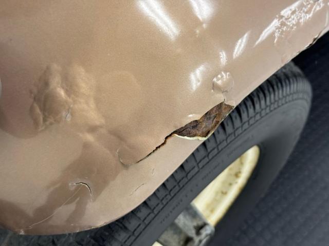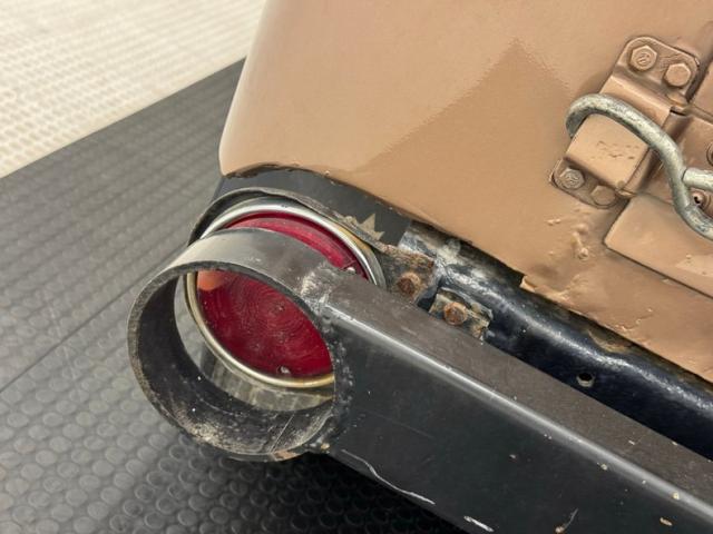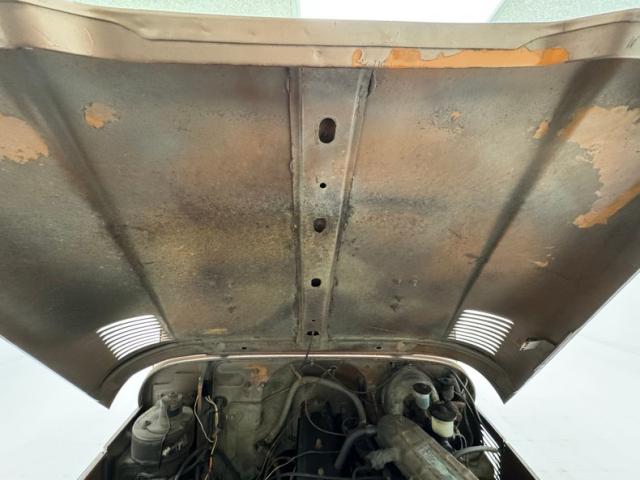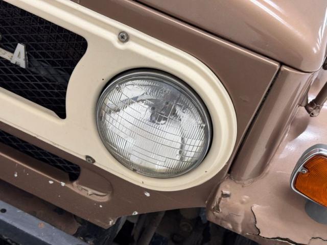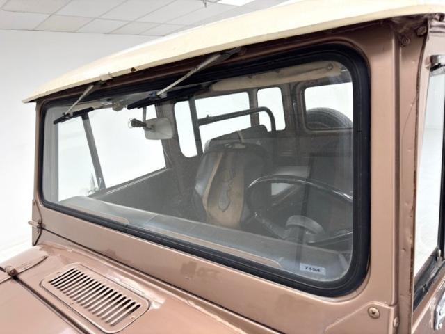 Pueblo Brown covers this rig with a distinctive Cygnus White roof, there to reflect light and heat when trekking the Serengeti, or the Trader Joe\'s parking lot in summer. Meanwhile, Pueblo Brown refers to the sun dried mud bricks of the southwest adobe. The white is picked up characteristically on the grille surround that takes in the round headlights, giving the FJ a familiar and recognizable face. White is also picked up by the 15-inch wheels that are 6 lug steelies with some earned patina. In profile, the FJ is wonderfully slab sided with articulated front fenders that bends at angles rather than circle over the wheel opening. Rear quarter windows wrap around the corners while the barn door type access doors under a rear hatch hold a spare over a trailer hitch mounted on the frame. Round tail lights are found on the same plane and protected by bumpers that leave circles at the end so the lights are visible and protected from boulders or bighorn sheep. Beginning in the drip rails, cracking paint is noted and on other parts of the truck we find cracking Bondo, panels and running boards that have rusted through, rusty hardware, and significant amounts of bubbling. If patina tells a story, this truck portrays a 12 part mini series.