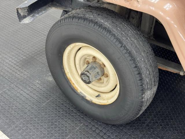 Not as rough as a stucco bathtub, but still replete with patina on the inside. Door panels have vinyl inserts and not much else, leading in to find bucket seats with vinyl and cloth in black and gray coverage under dirty seat covers, and the driver\'s seat is raised with a wood box.In back, gray vinyl benches face inwards, fun for kids and kids at heart, and they can wear dirty boots because the vinyl mat on the floor won\'t suffer from a little more wear. Behind the black plastic steering wheel is a dash that definitely looks ex military and a tachometer has been added to the column in front of a modest speedometer and other gauges. To the right, knobs with age to them take their place on the brown dash panel along with an AM/FM radio. The glovebox wears an engraved shifting diagram revealing the operation of the floor mounted sticks. There\'s vinyl flooring up here as well along with Toyota branded rubber mats. Pedals are wrapped in black electrical tape, we\'re guessing to keep the rubber pads on. A perforated headliner is still in place, weathered but mostly intact.