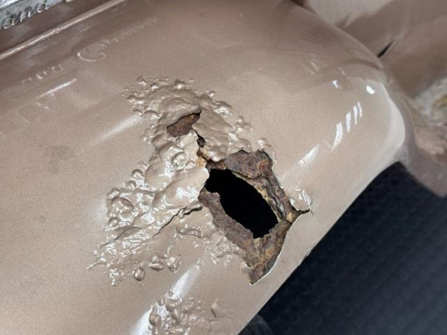 As expected, surface rust, oil, layers of caked on sooty grease, and areas of substantial invasive rust exist underneath. The single exhaust is intact and flows through a stock style muffler before sending out an exhaust pipe. Leaf spring suspension is utilized front and rear.